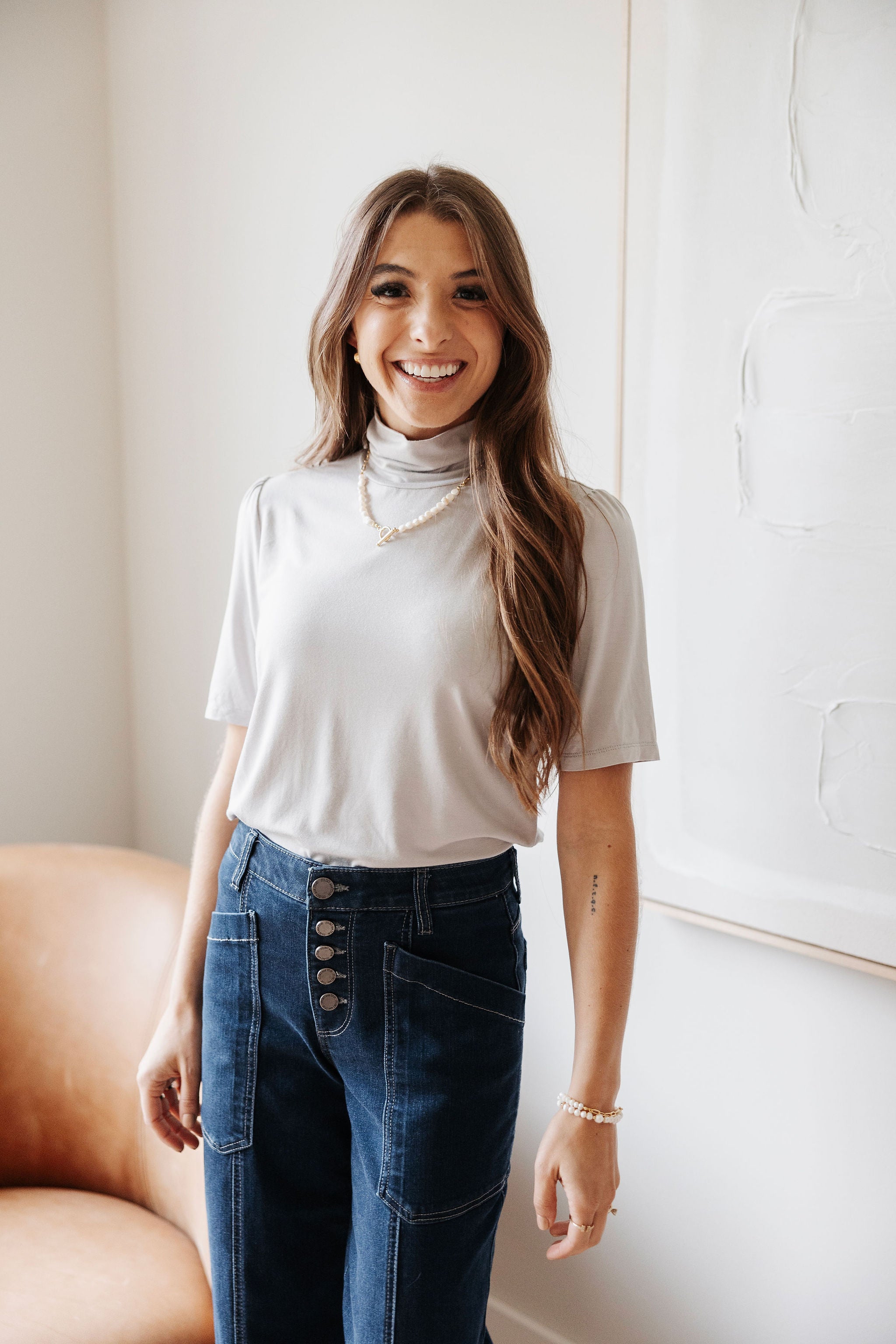 Sleek, soft, and endlessly versatile—the Mac and Me Mock Neck Top is the wardrobe essential you didn’t know you needed. With its smooth mock neckline and relaxed short sleeves, it brings just the right mix of polish and ease. Dress it up with tailored pants and layered jewelry for a chic night-out look, or keep it casual tucked into denim for everyday style. Timeless, flattering, and oh-so-comfortable—this is a layering piece you’ll reach for season after season.