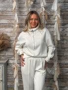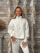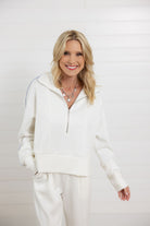 The quarter-zip neckline adds a sporty touch, while the relaxed fit and wide hem create effortless shape. Subtle seam detailing enhances the tailored feel, making this piece perfect for styling as a matching set or pairing with denim for an elevated casual look.