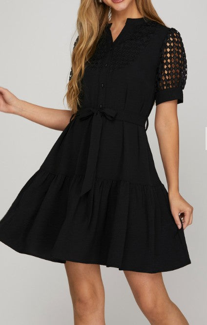 Classic sophistication with a touch of playful charm — the Midnight Charm Mini Dress is your go-to for effortless elegance. Featuring delicate crochet lace short sleeves, a flattering button-down front, and a self-tie belt to cinch the waist, this dress offers a perfectly polished silhouette. The tiered skirt and handy side pockets add both movement and function, making it as practical as it is chic. From daytime brunches to evening soirées, this little black dress does it all with grace.