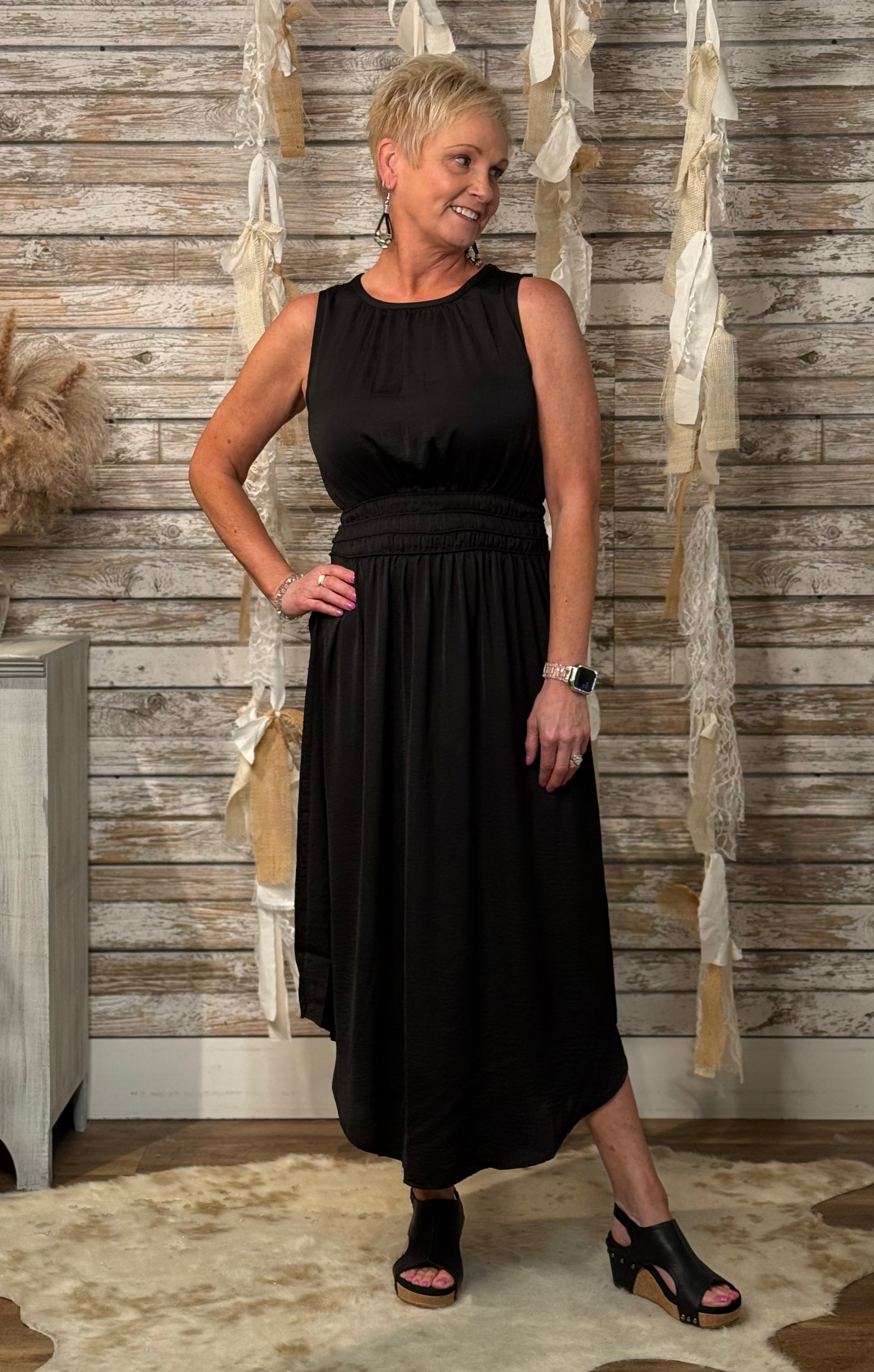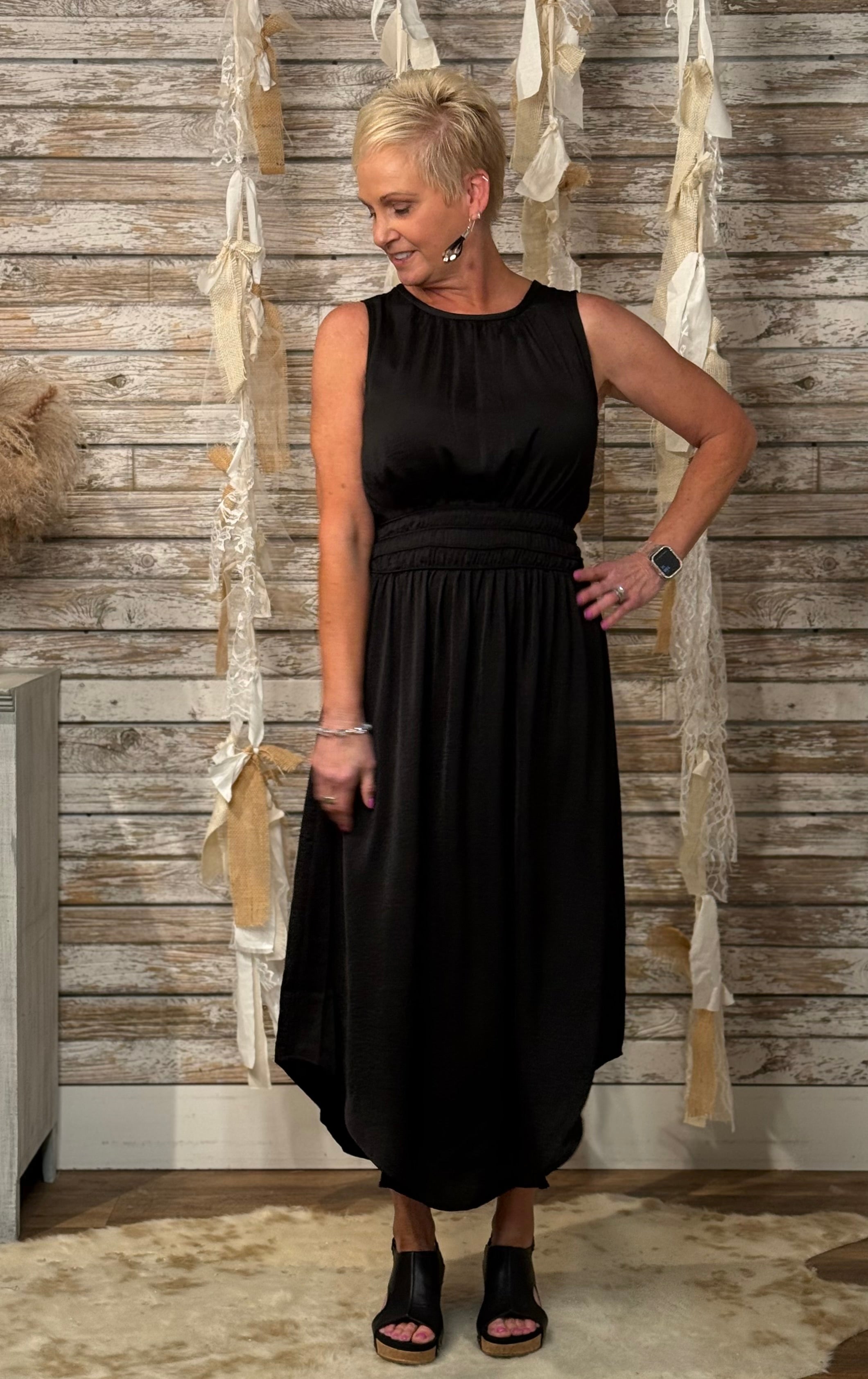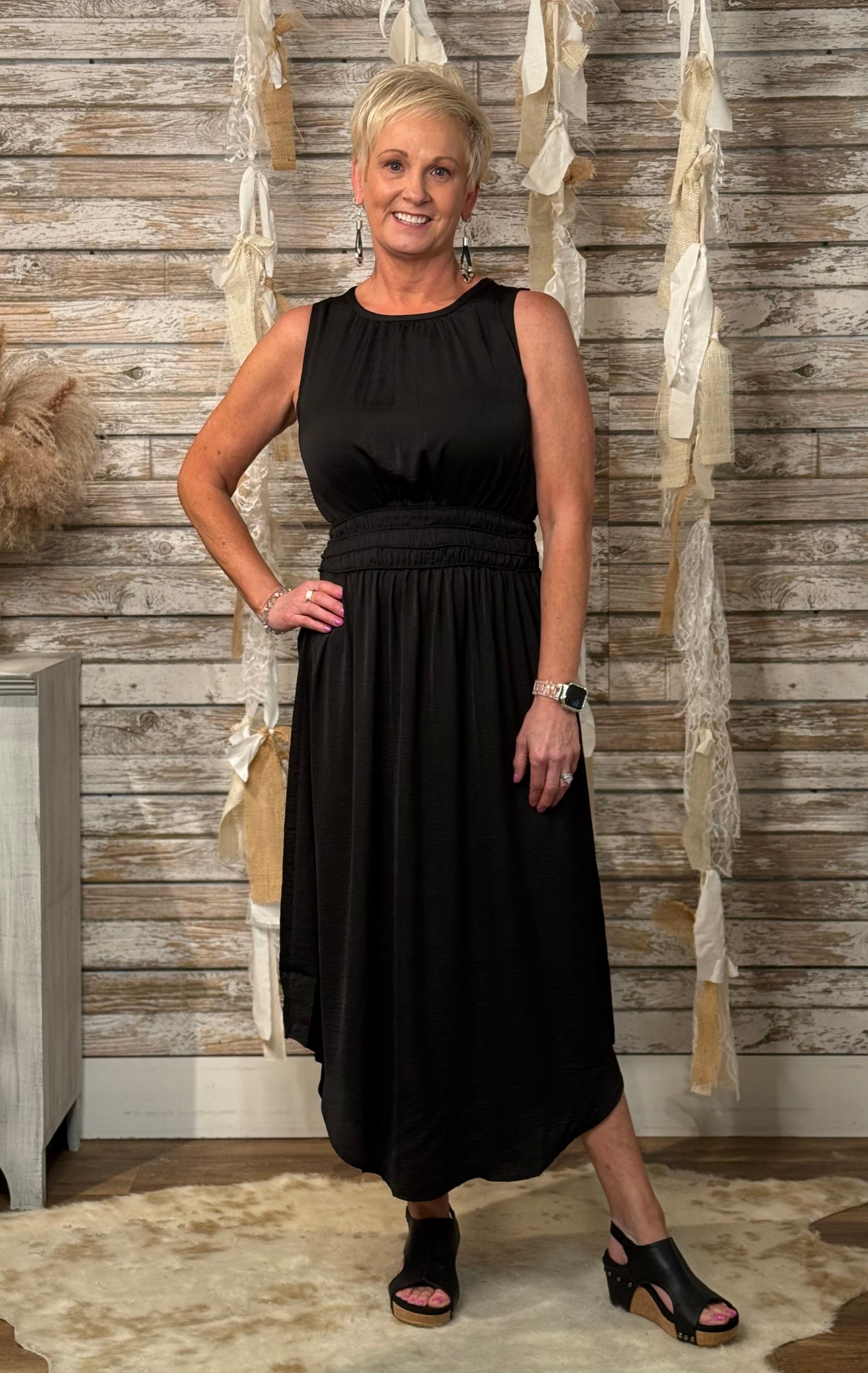 Sleek, polished, and effortlessly stunning — the Midnight Grace Midi Dress features a chic crew neckline, soft gathers at the waist for a flattering fit, and a flowy asymmetrical hemline. Whether you're headed to a special event or a stylish dinner out, this timeless black beauty brings effortless elegance to every moment.