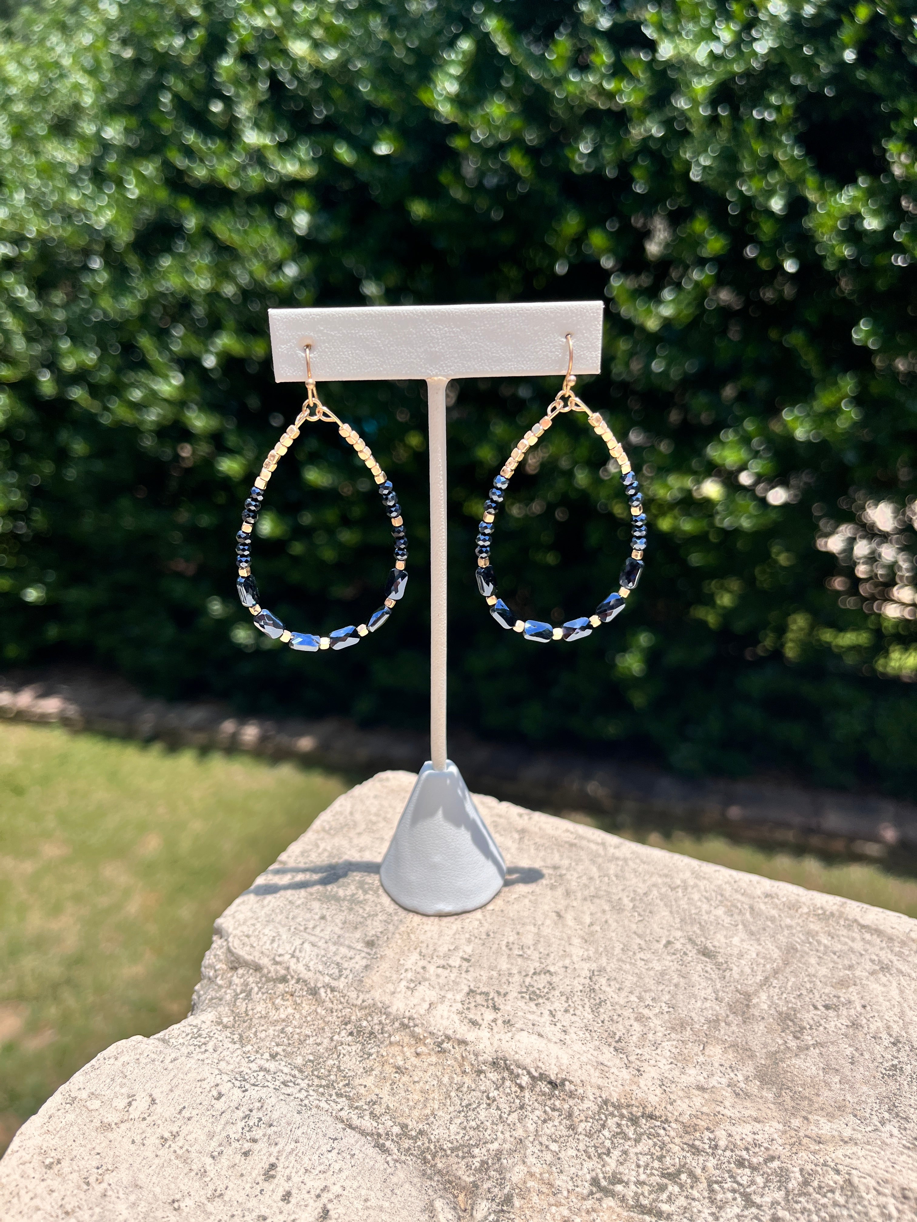 Delicate yet dazzling, these teardrop-shaped hoops feature a blend of deep navy, gold, and crystal beads that shimmer like stars in the night sky. Lightweight with a golden wire base, they bring just the right touch of sparkle to your everyday magic.