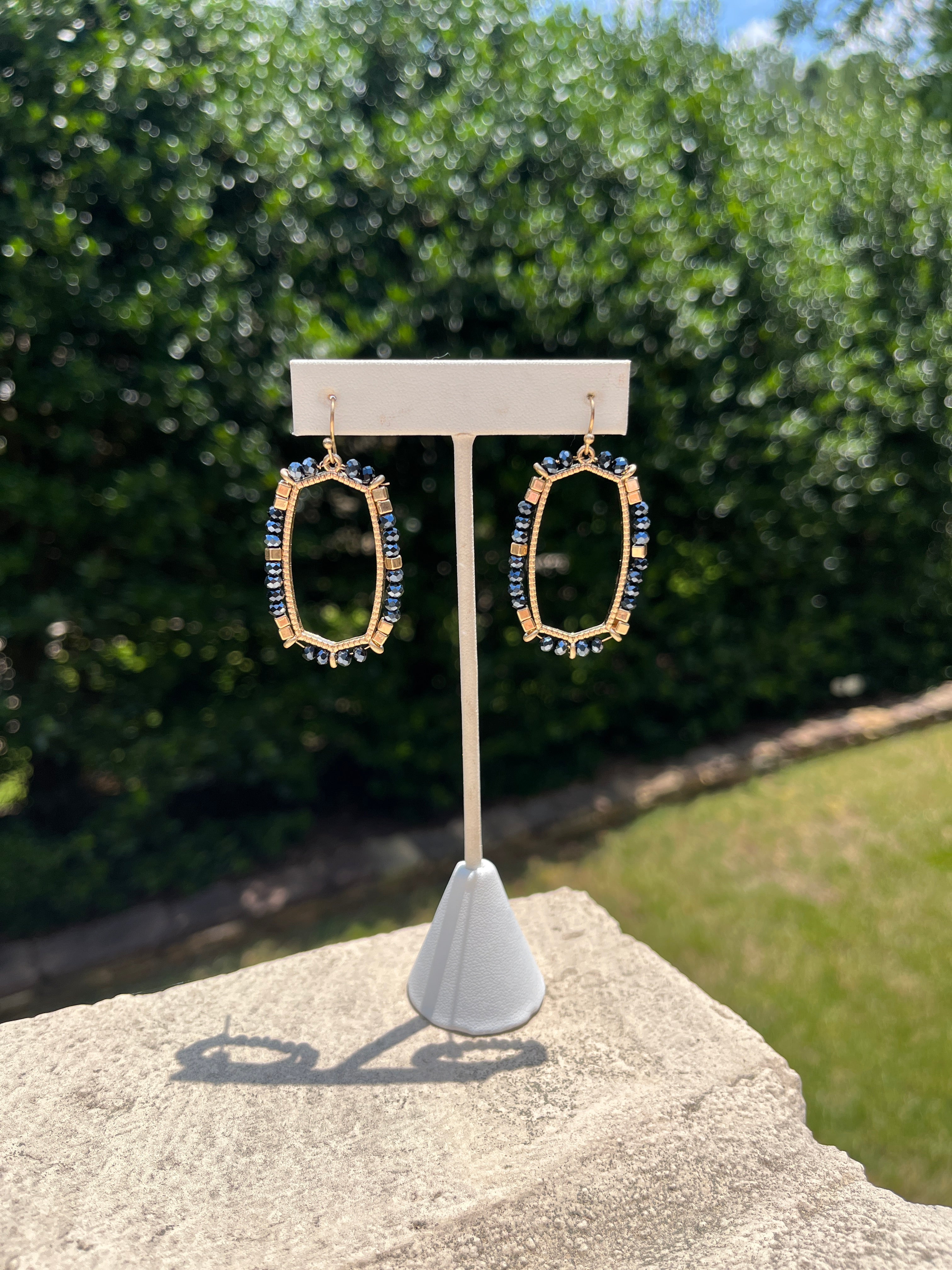 Framed in a golden oval silhouette, these earrings are dotted with deep navy and shimmering crystal beads for a striking pop of contrast. Chic, sparkly, and full of personality—these stunners bring just the right amount of edge to your everyday glam.