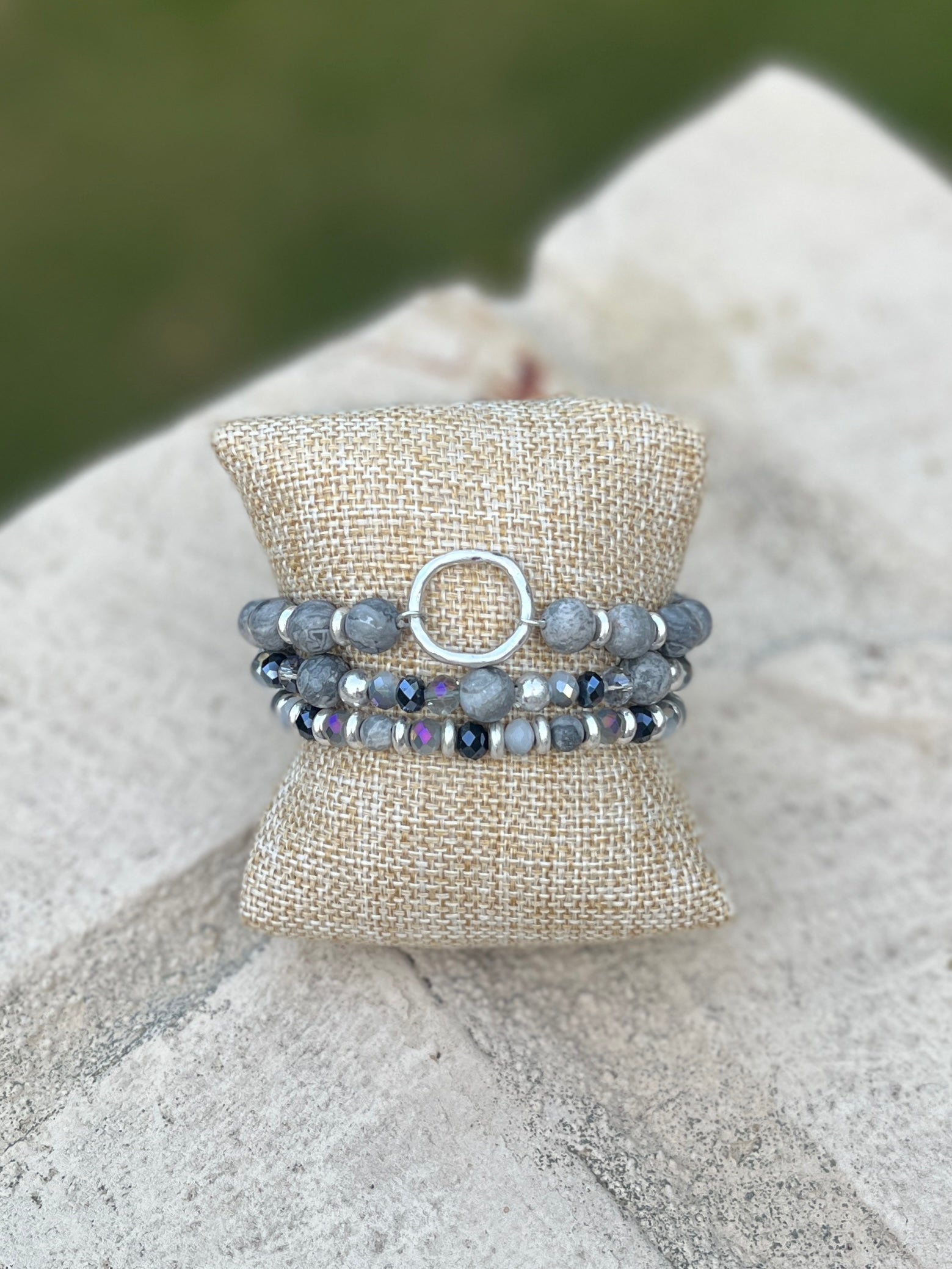 Smoky greys, shimmering crystals, and a bold silver circle come together in this dreamy stretch bracelet stack. Layered elegance with just the right touch of cosmic cool.