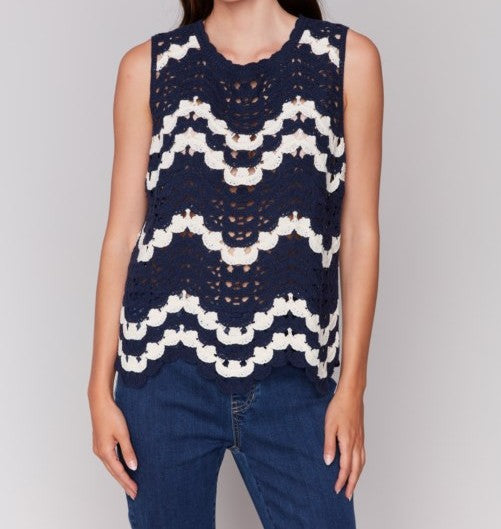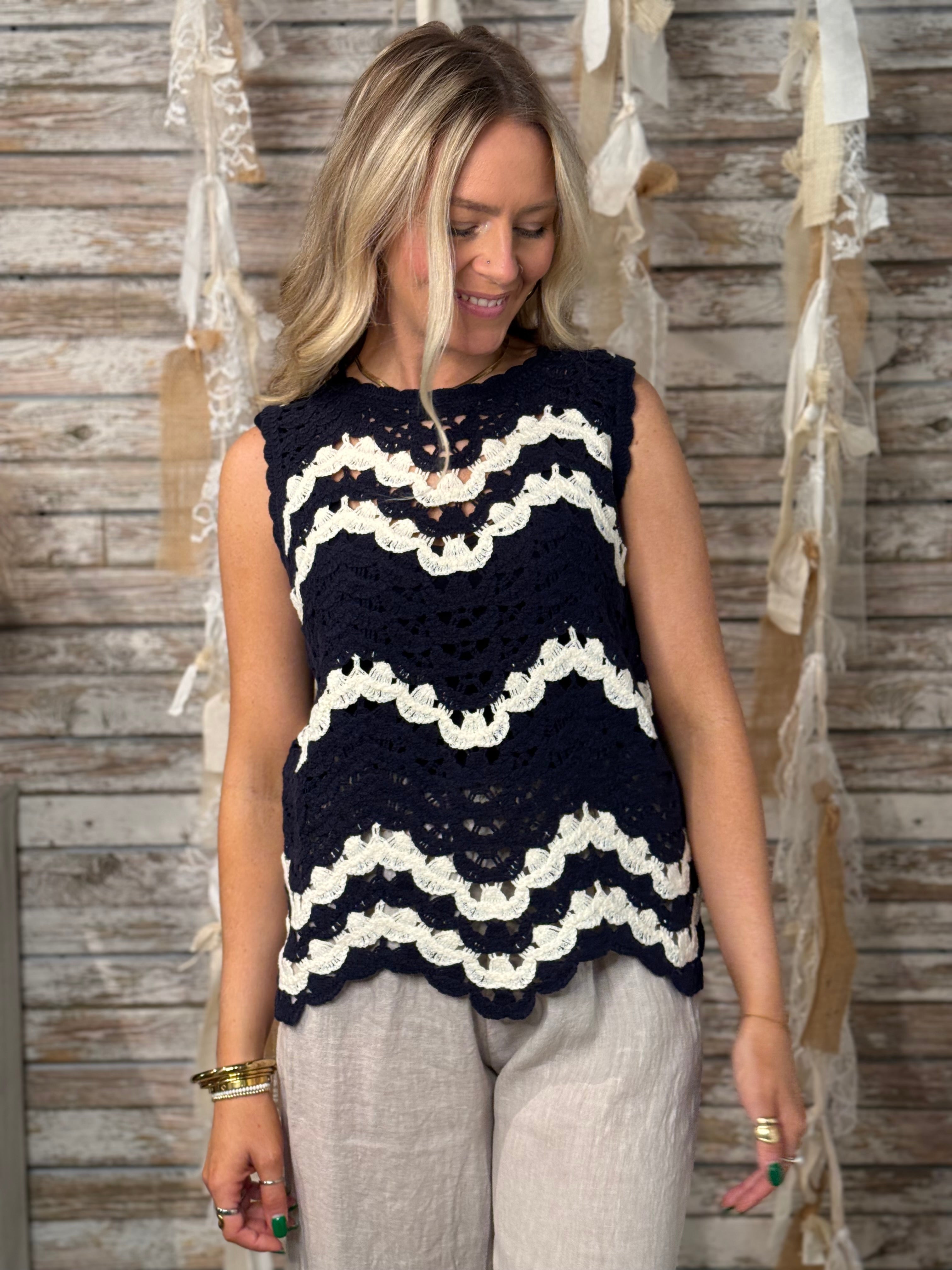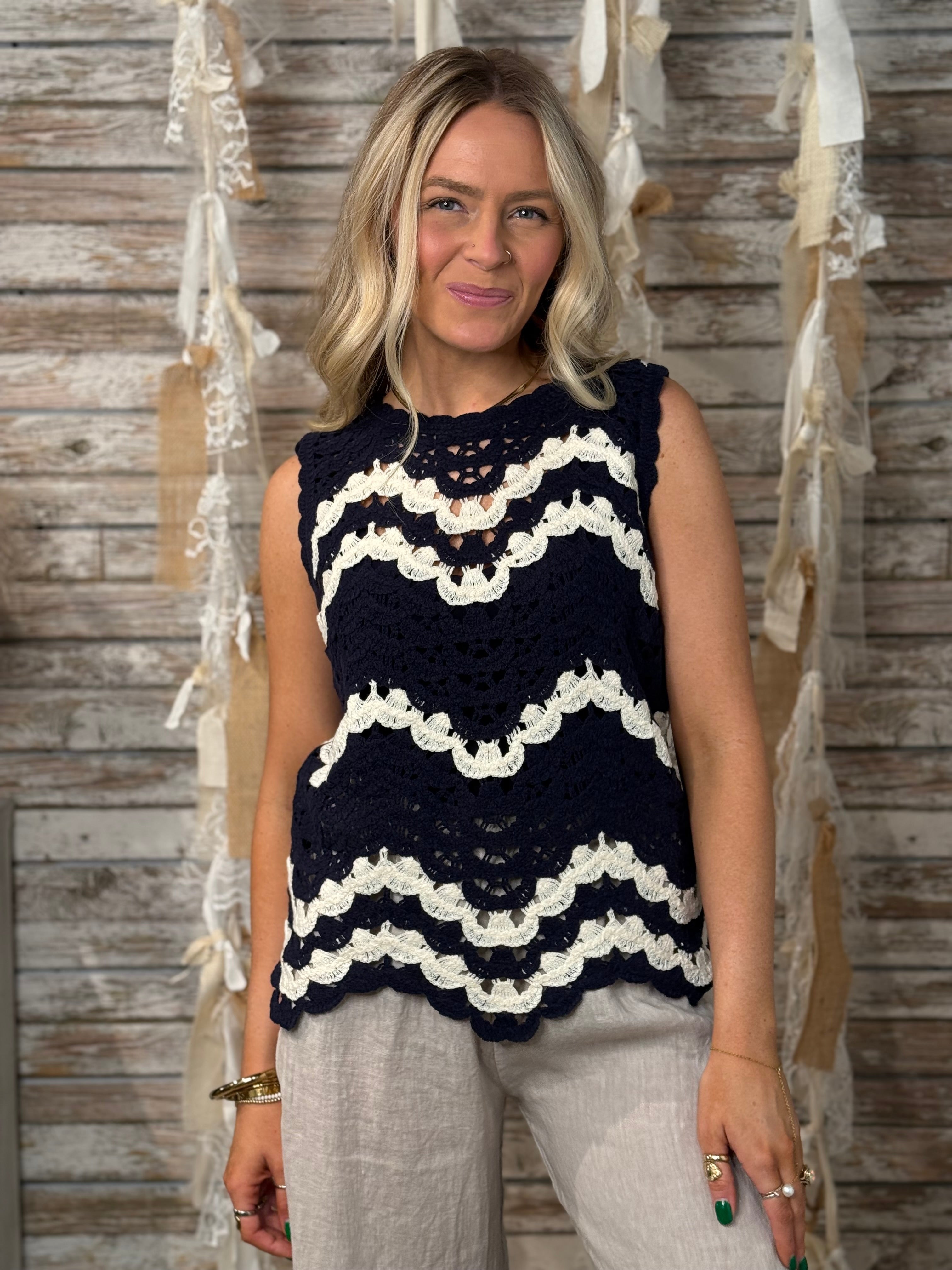 Set sail in style with the Nautical Lace Wave Tank. This sleeveless navy top features scalloped crochet lace in a bold wave pattern, accented with cream detailing for a striking contrast. The intricate openwork design adds a breezy, elegant texture—perfect for pairing with denim or layering under a blazer for a coastal-chic vibe.