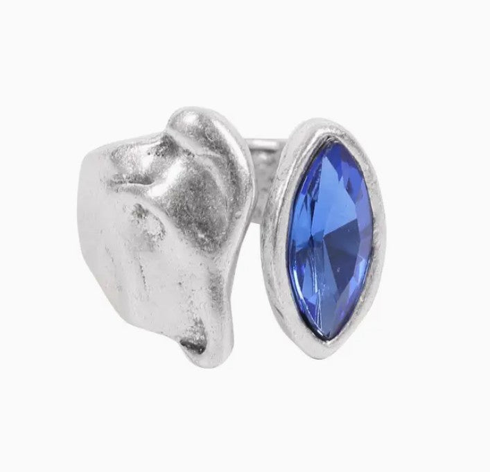 Make a bold impression with the Ocean Ember Wrap Ring. This handcrafted silver-tone ring features a striking marquise-cut blue crystal paired with an organic molten-metal form on the other end. Its open design blends modern edge with artisan flair—perfect for those who love their accessories with a twist.