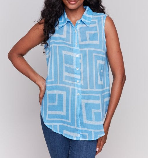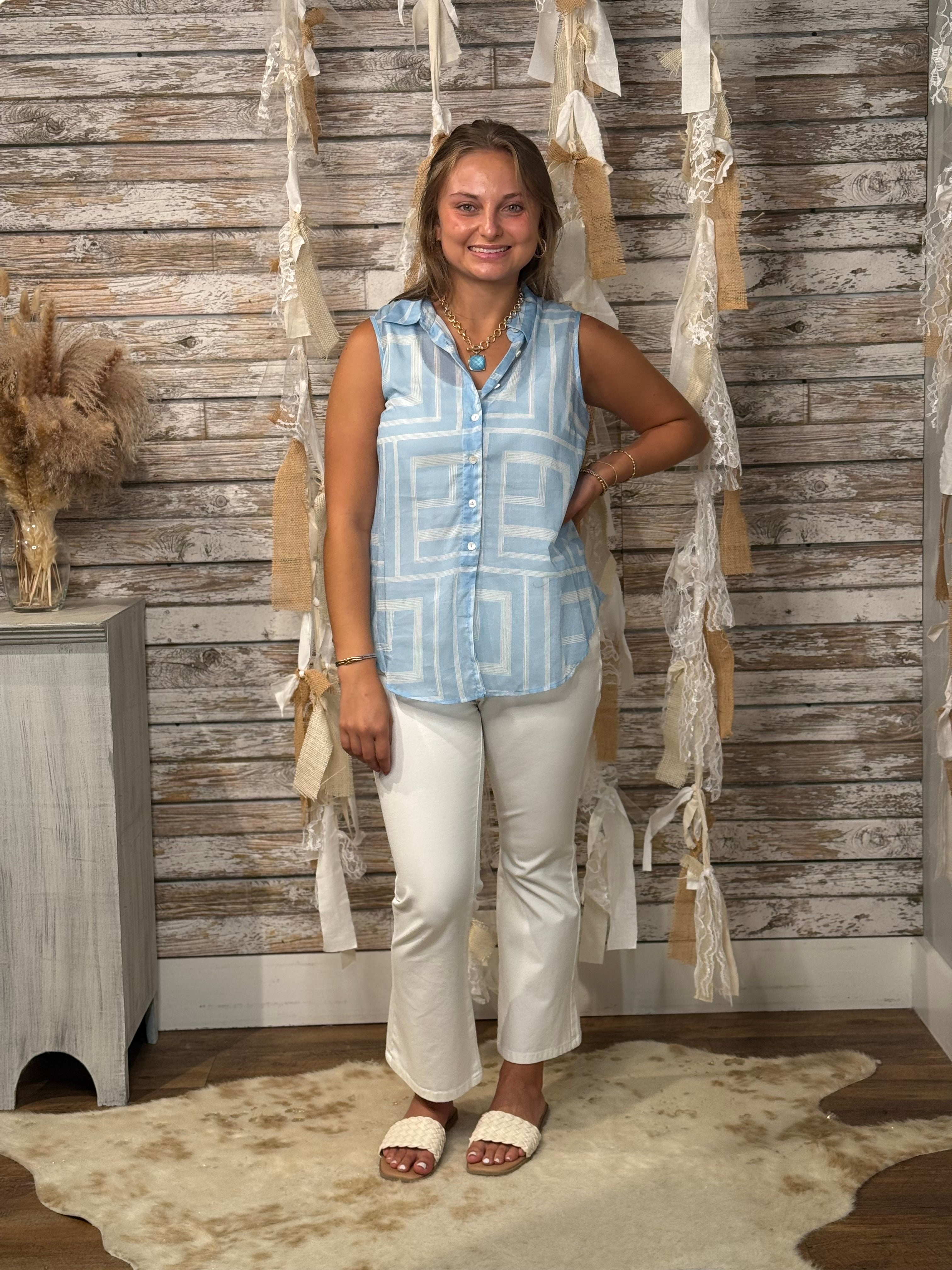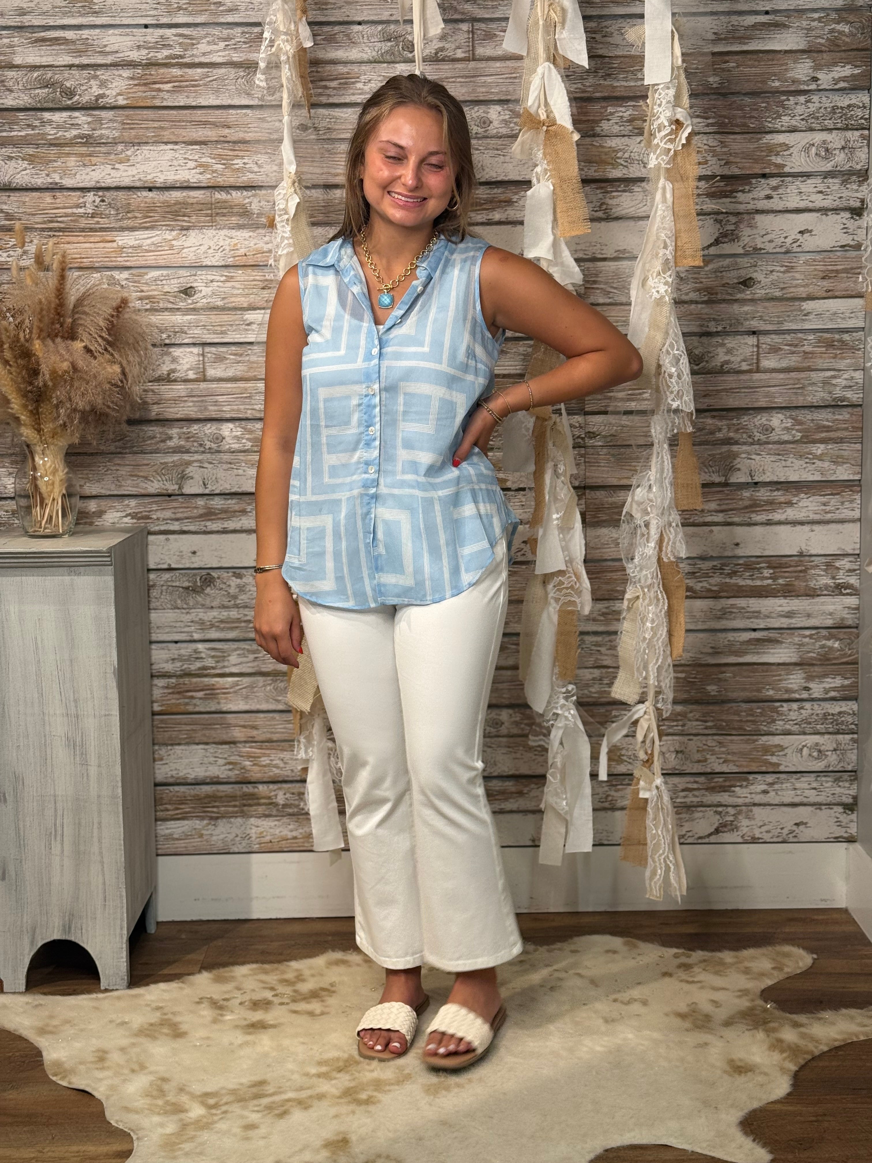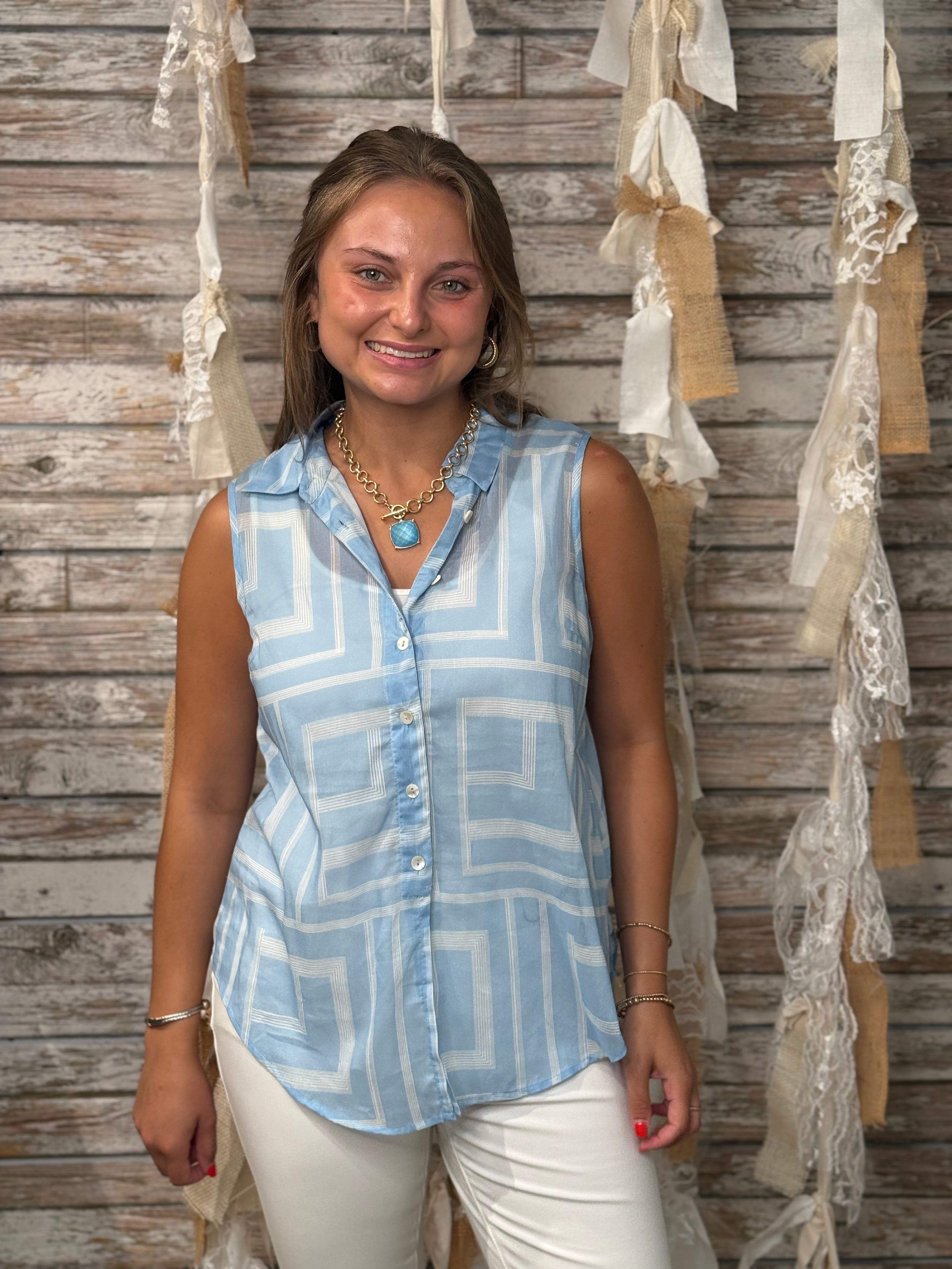 Cool, crisp, and effortlessly modern—the Ocean Maze Sleeveless Top features a geometric grid print in vibrant sky blue, perfect for brightening any look. With a button-down front, classic collar, and relaxed silhouette, this lightweight top keeps things breezy and polished whether you're heading to brunch or out for a seaside stroll.