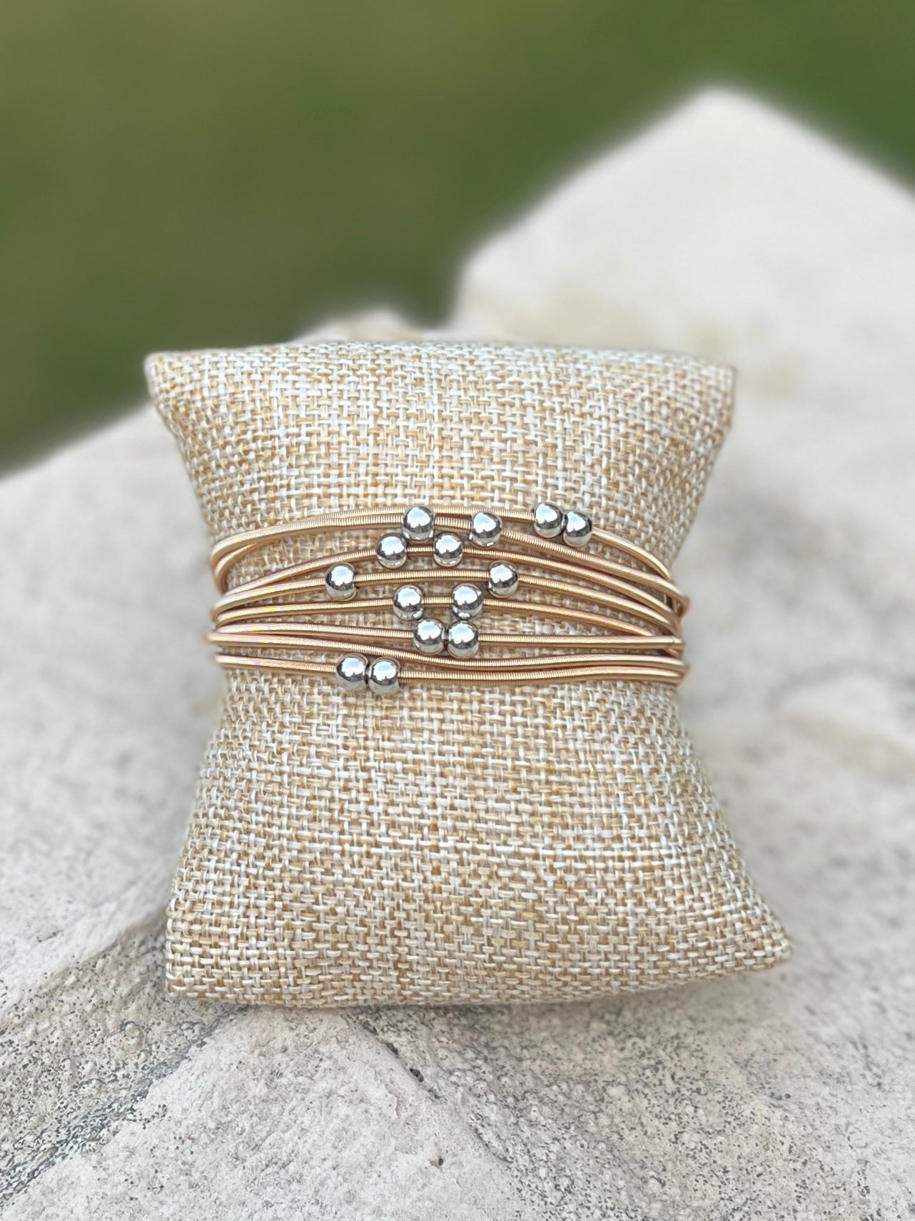 This multi-wire gold glow bracelet stack dazzles with clustered silver-tone beads that catch the light like tiny planets in motion. Flexible, lightweight, and effortlessly chic, it adds a cosmic shimmer to both casual and dressy looks.