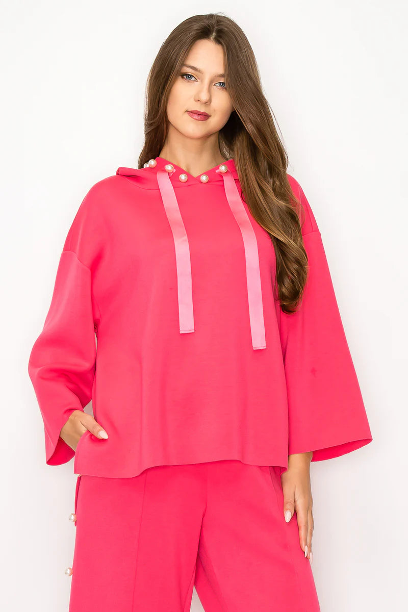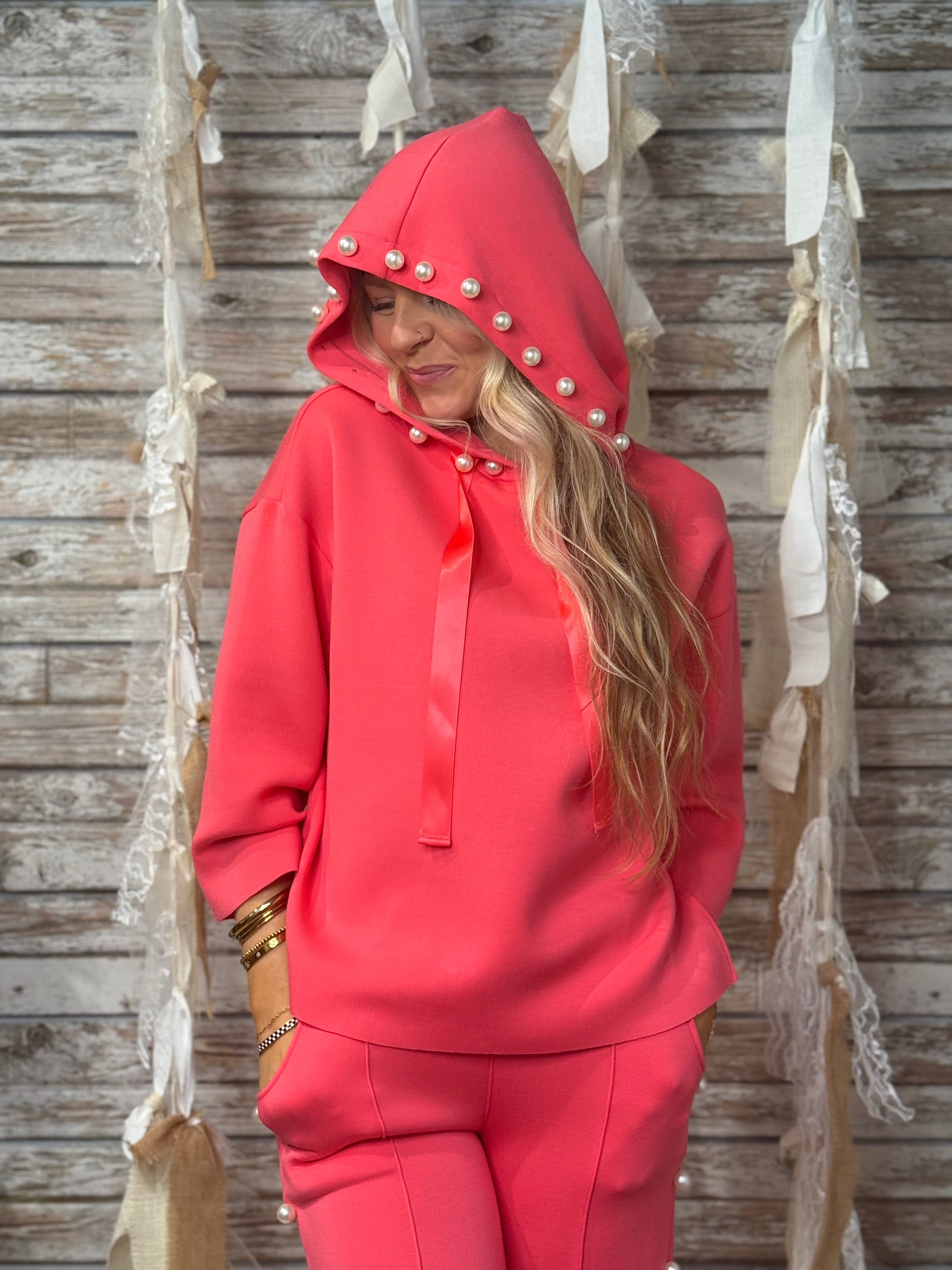 Bold meets beauty in the Pearl Power Hoodie — a luxe twist on casual cool. Drenched in a rich, statement red and detailed with elegant pearl accents along the neckline and side, this relaxed-fit hoodie brings high-fashion energy to your everyday wardrobe. Flowy sleeves, elevated fabric, and just the right amount of drama? Yes, please. Comfort never looked so glam.