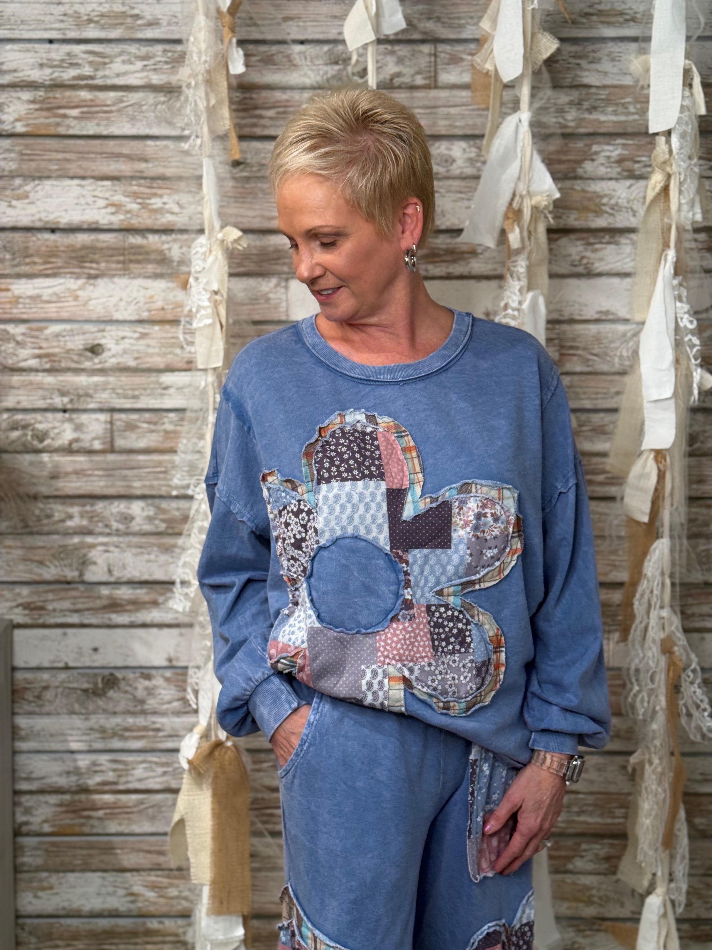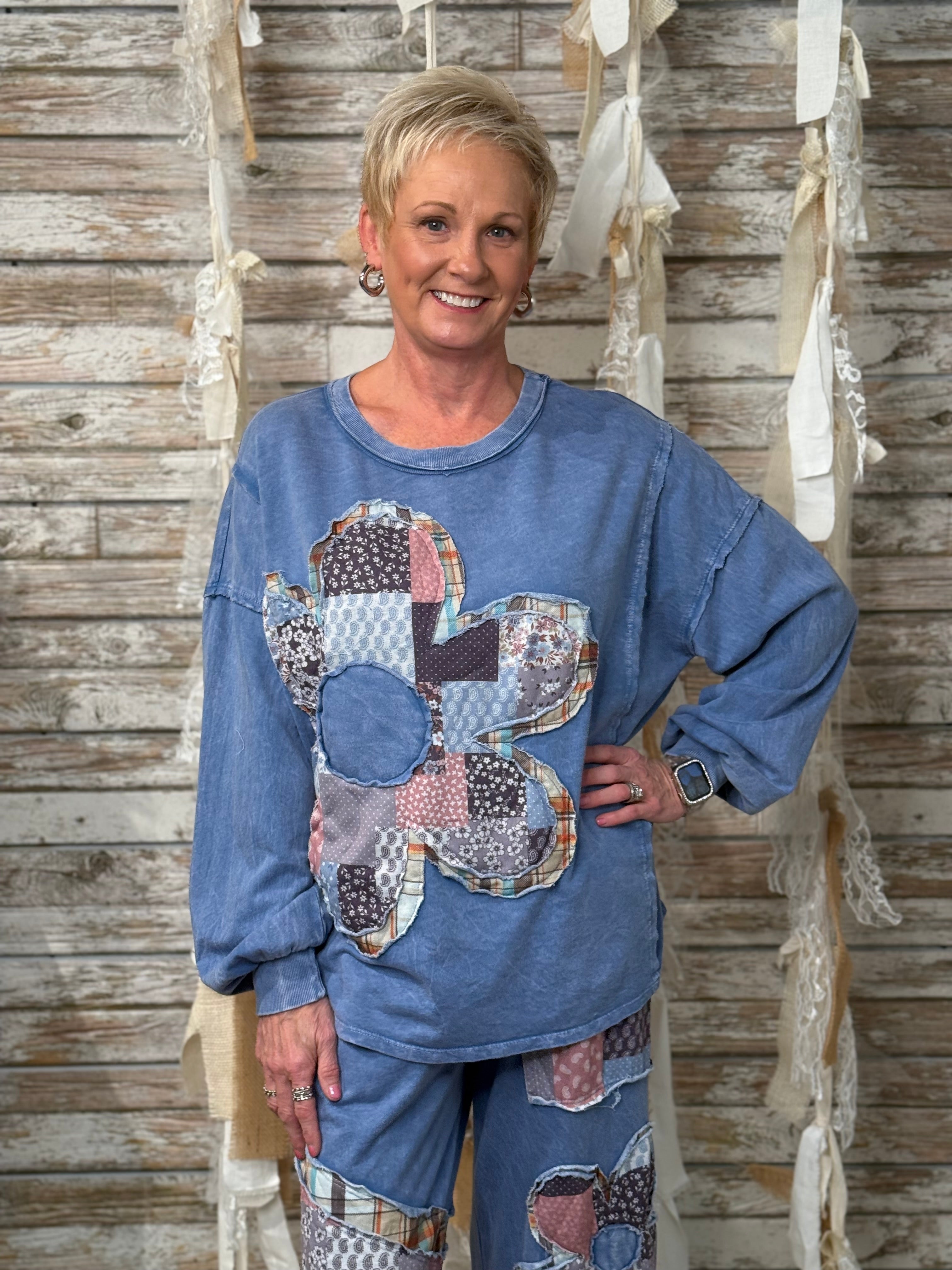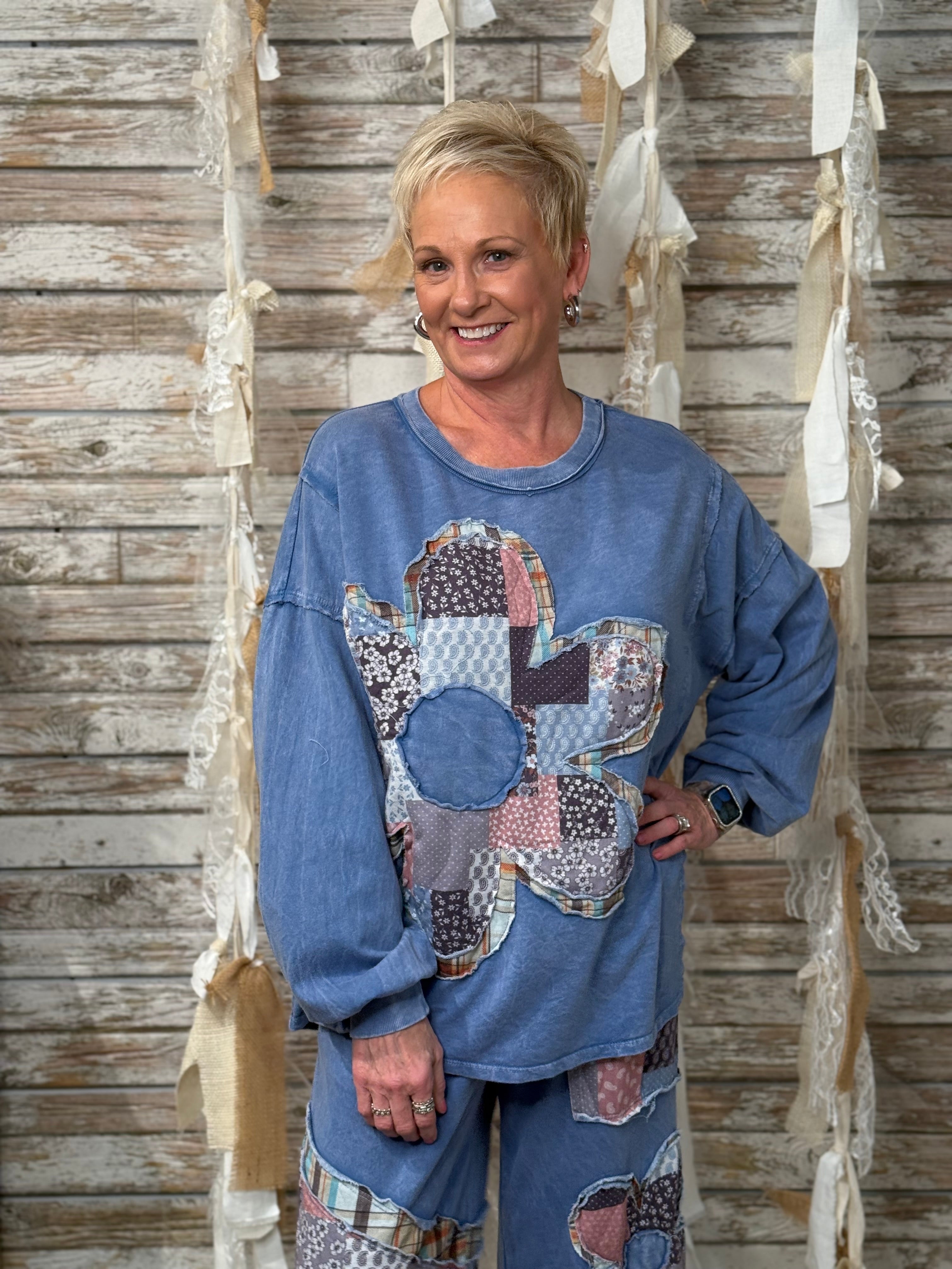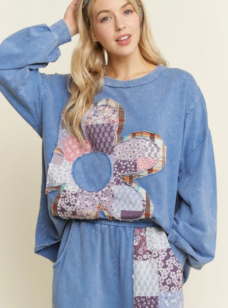 Flower power meets laid-back loungewear in the Petal to the Metal Sweatshirt. Washed to vintage perfection, this oversized long sleeve features a statement patchwork daisy made from charming boho prints—each petal stitched with feel-good nostalgia. With its soft mineral-washed blue and relaxed drop-shoulder fit, it's the cozy-cute combo your closet’s been dreaming of. Pair it with your favorite denim or matching patch pants for instant retro bliss.