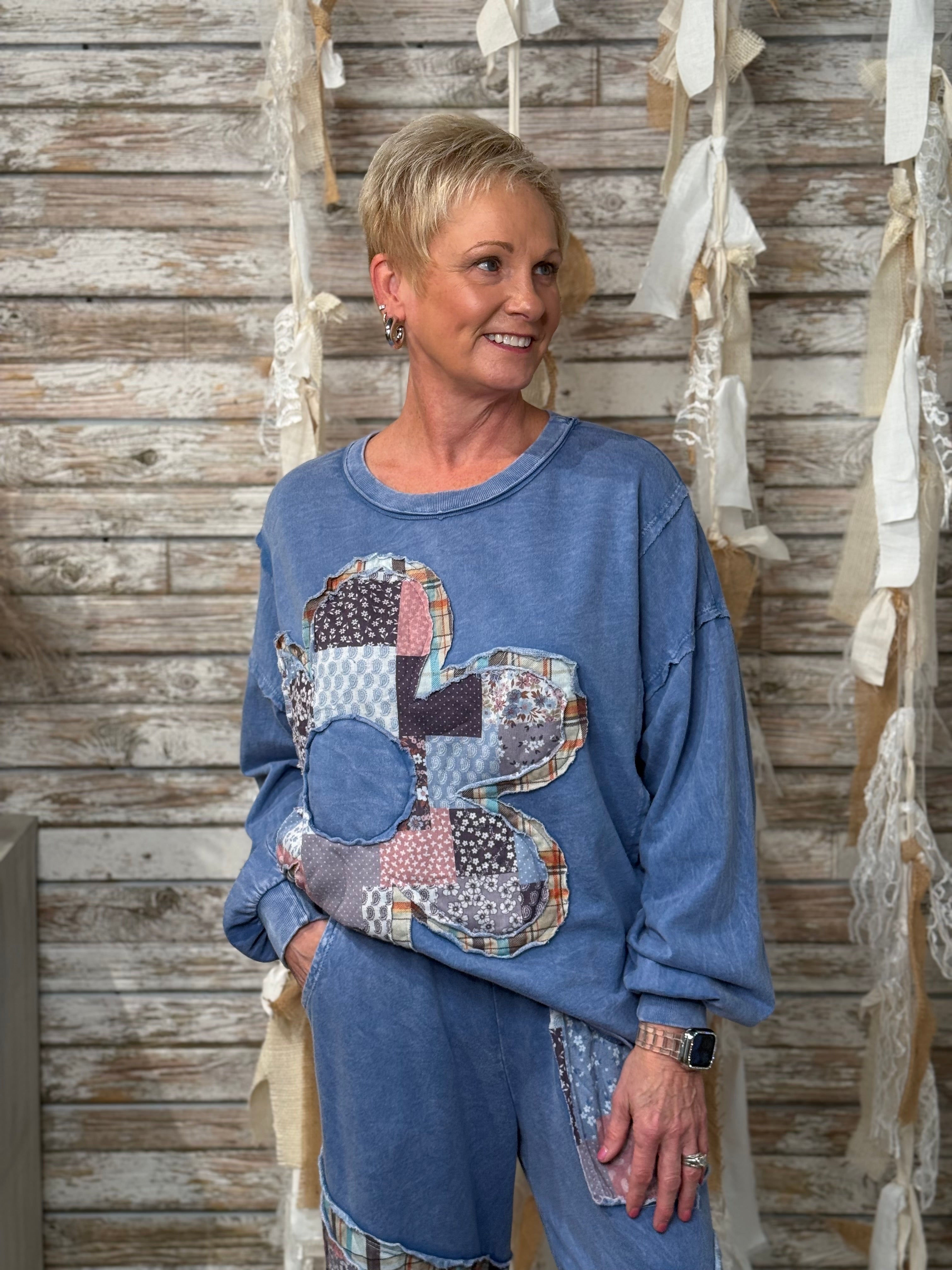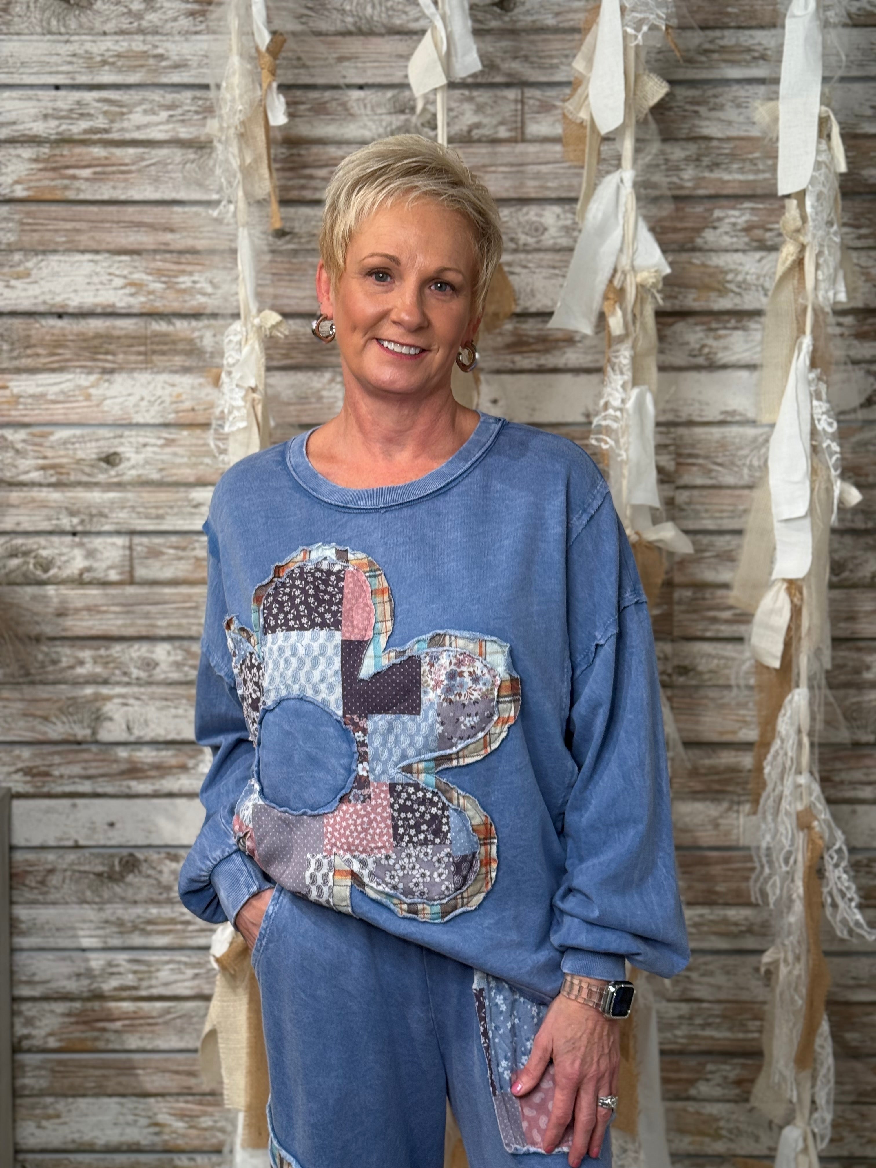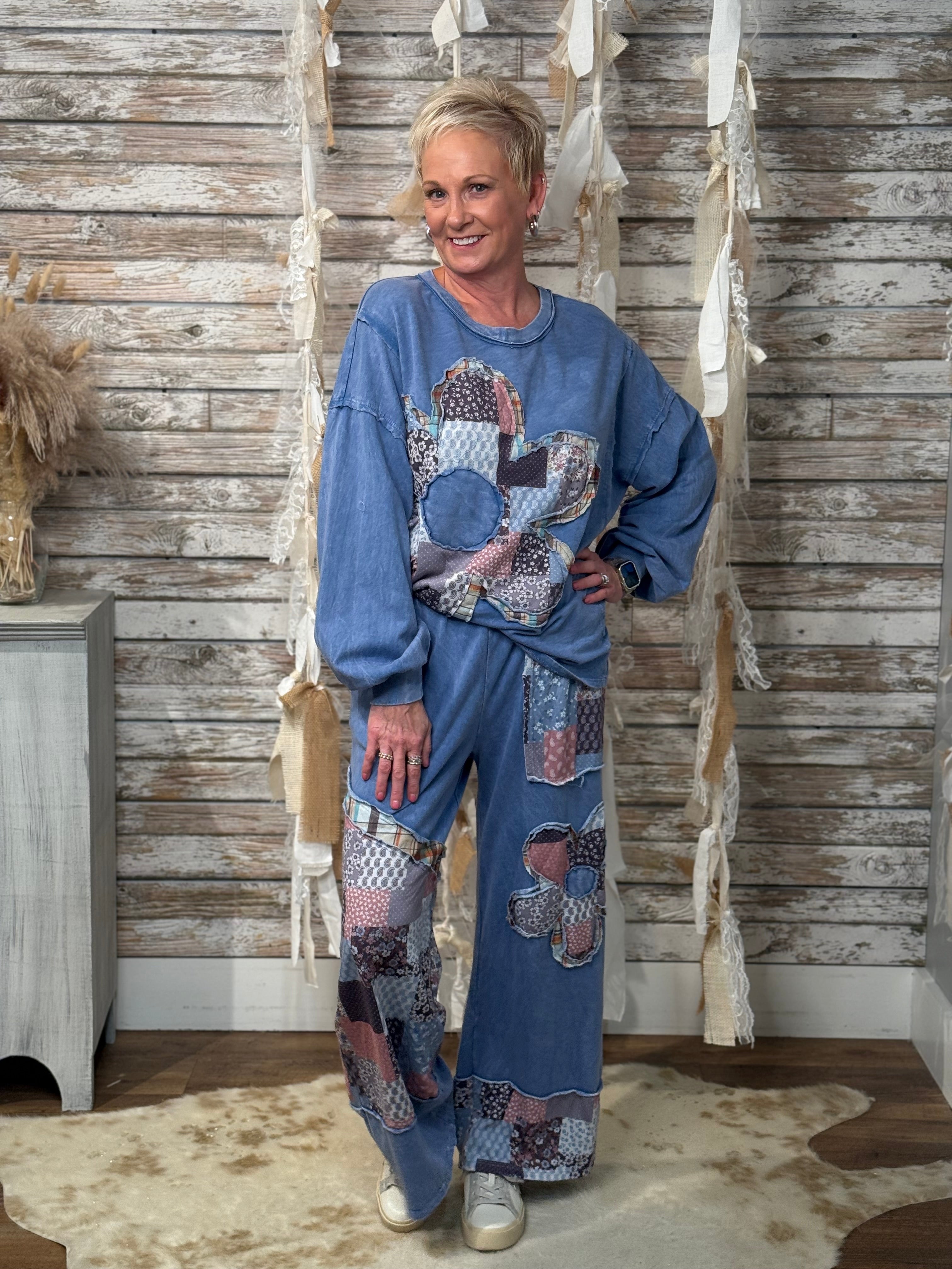 Flower power meets laid-back loungewear in the Petal to the Metal Sweatshirt. Washed to vintage perfection, this oversized long sleeve features a statement patchwork daisy made from charming boho prints—each petal stitched with feel-good nostalgia. With its soft mineral-washed blue and relaxed drop-shoulder fit, it's the cozy-cute combo your closet’s been dreaming of. Pair it with your favorite denim or matching patch pants for instant retro bliss.