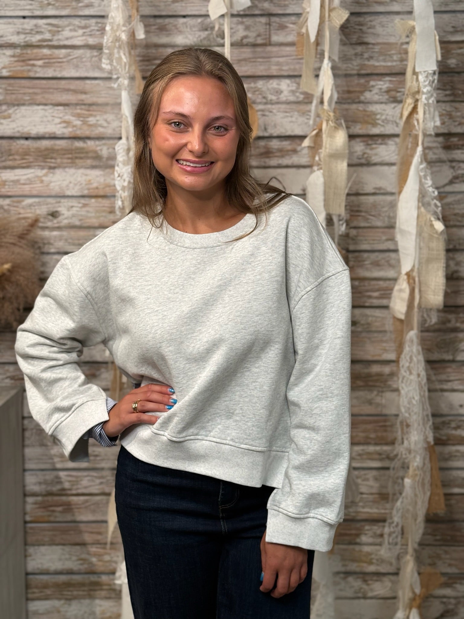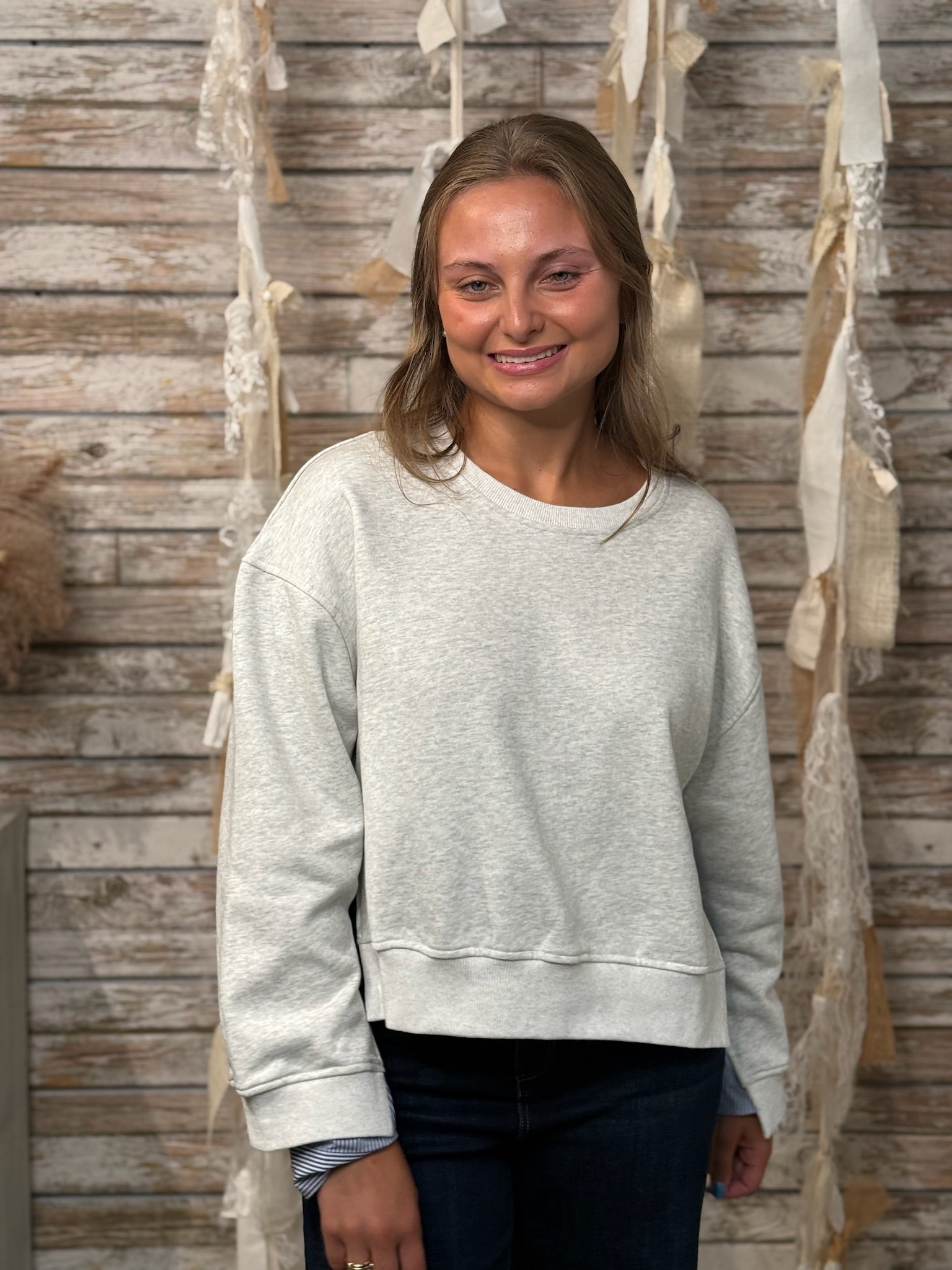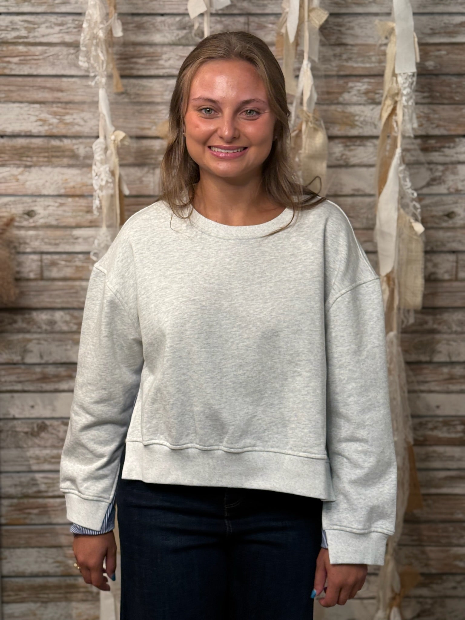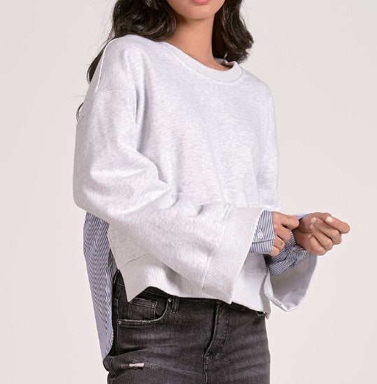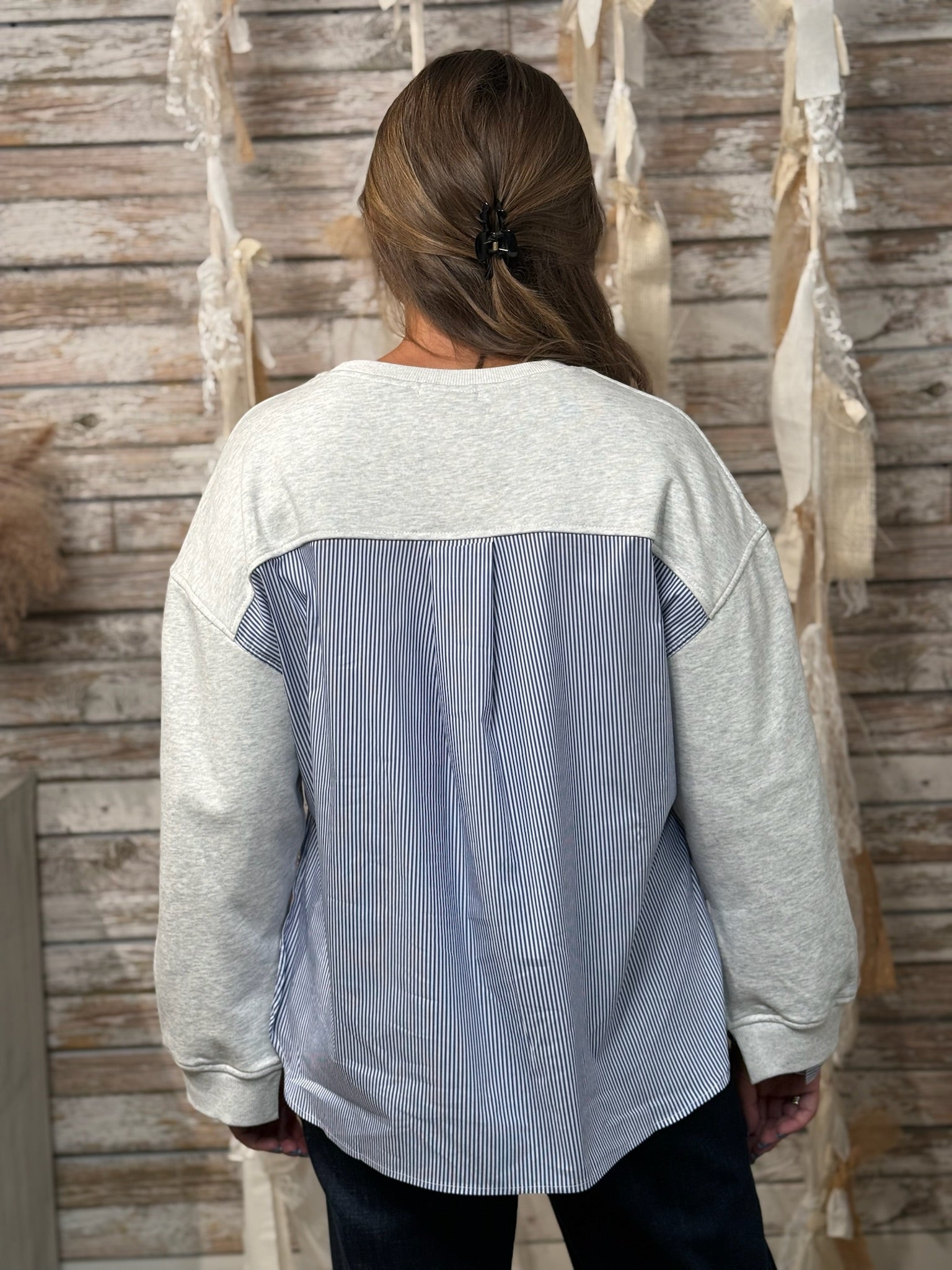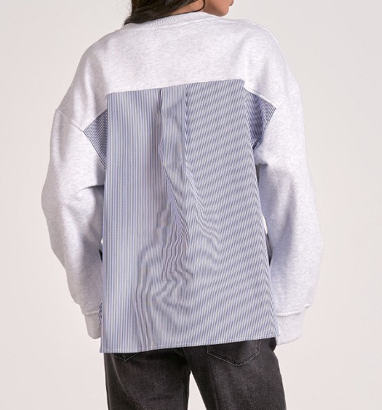 Redefine casual with the Pinstripe Remix Sweatshirt — a fresh spin on a classic. This light heather grey pullover features unexpected contrast with crisp navy pinstripe shirting panels at the back and peeking from the cuffs, adding a tailored touch to your laid-back look. The relaxed fit, raw hem, and wide sleeves keep it effortlessly cool while the mixed materials elevate it beyond basic. Perfect for when you want to feel cozy but look put-together.