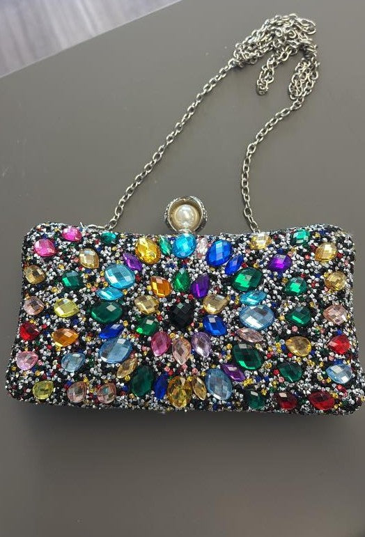 Turn heads with the Prism Parade Jewel Clutch—a dazzling statement piece bursting with vibrant multicolor gems and sparkling beaded details. The structured silhouette, pearl clasp closure, and silver chain strap add glam sophistication to this party-perfect accessory. Whether you're hitting the town or elevating a simple outfit, this clutch is pure magic in your hands.