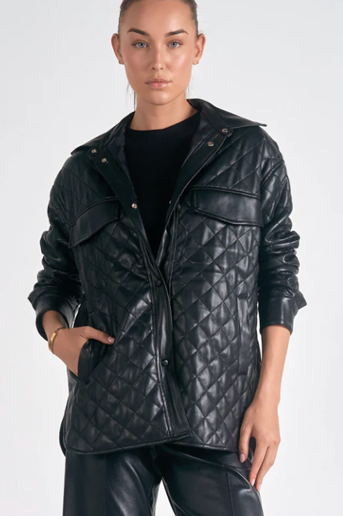 Step out in style with this quilted faux leather jacket. This trendy piece features a luxurious quilted pattern that adds texture and sophistication to your look as well as snap button closure and chest pockets for functionality.