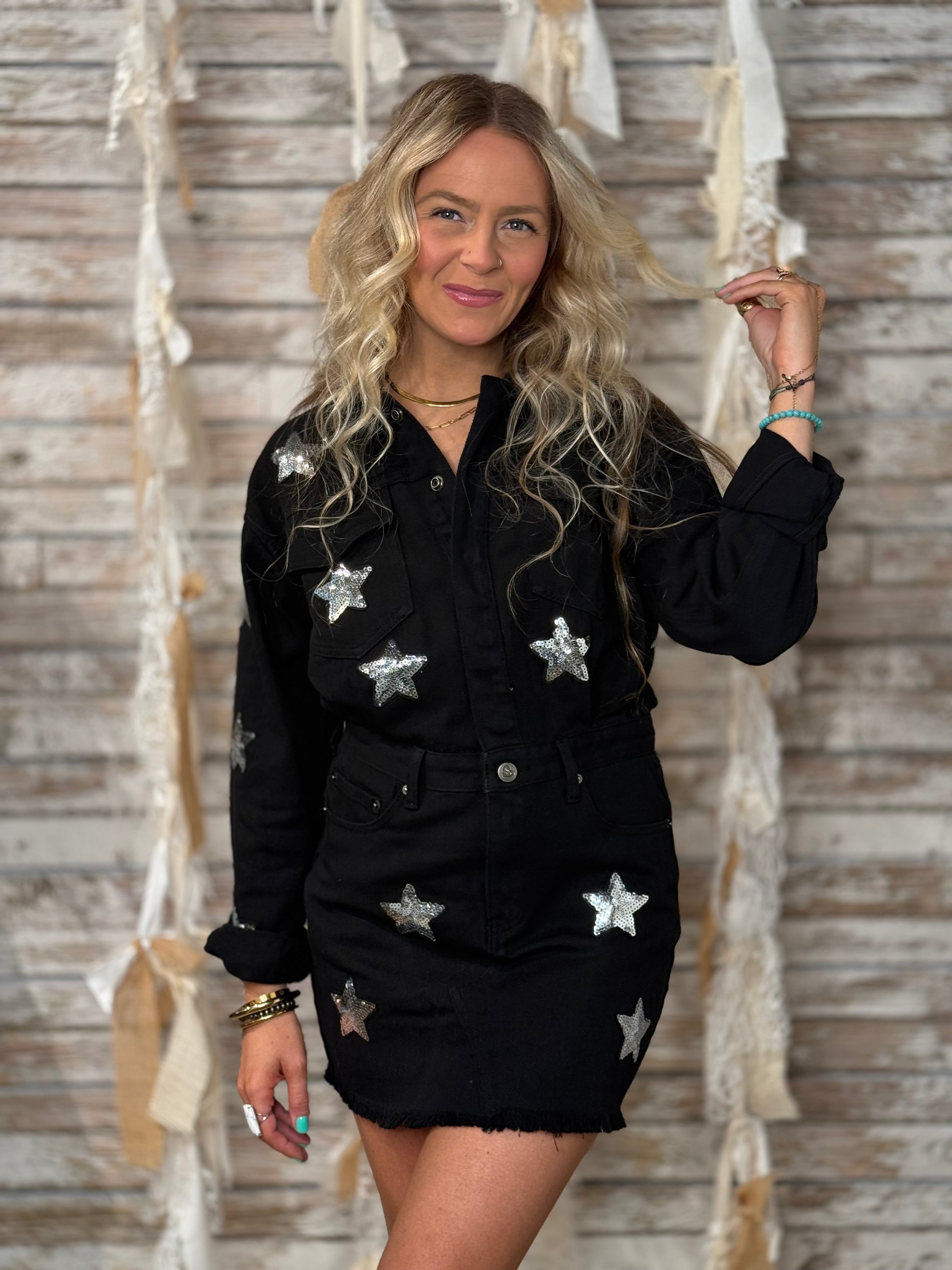 Shine on, cowgirl! The Raelynn Starstruck Denim Dress is a statement-maker with bold star sequin appliqués scattered across a classic utility-style silhouette. Featuring a button-up front, long sleeves, flap chest pockets, and a flattering mini length with a raw hem, this dress blends edgy sparkle with western flair. Available in both crisp white and classic black, it's the perfect choice for concerts, rodeos, or any night you’re ready to steal the spotlight.