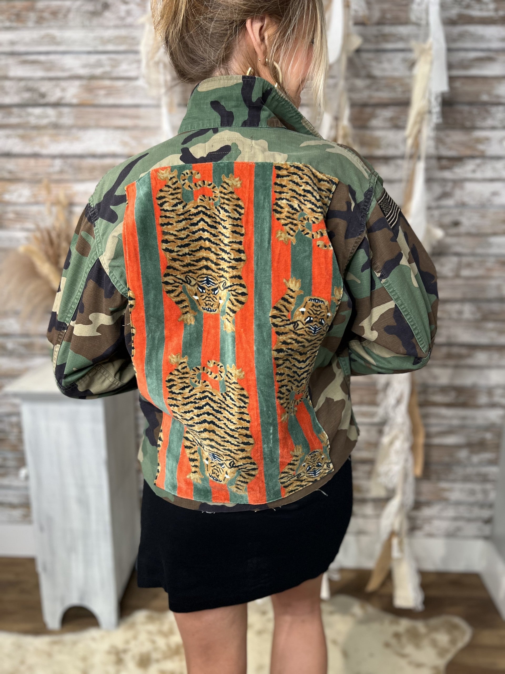 Stand out in the crowd with the Rebel Remix Camo Tiger Jacket — a one-of-a-kind cropped layer with attitude. Featuring unique camo patterns, raw edge details, bold tiger accents, and a street-chic silhouette, this statement piece brings bold energy to any outfit. No two are alike, because your style shouldn’t be either.