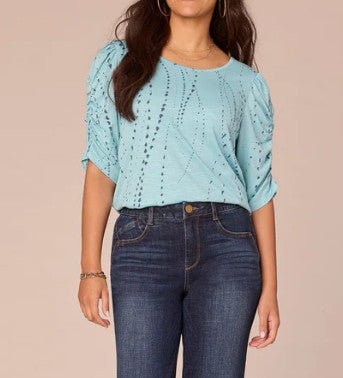 Ruched Sleeve Scoop Neck Printed Top - HQ
