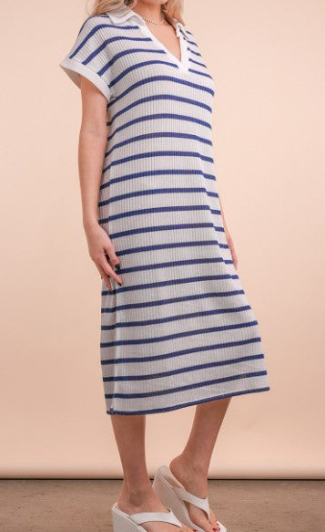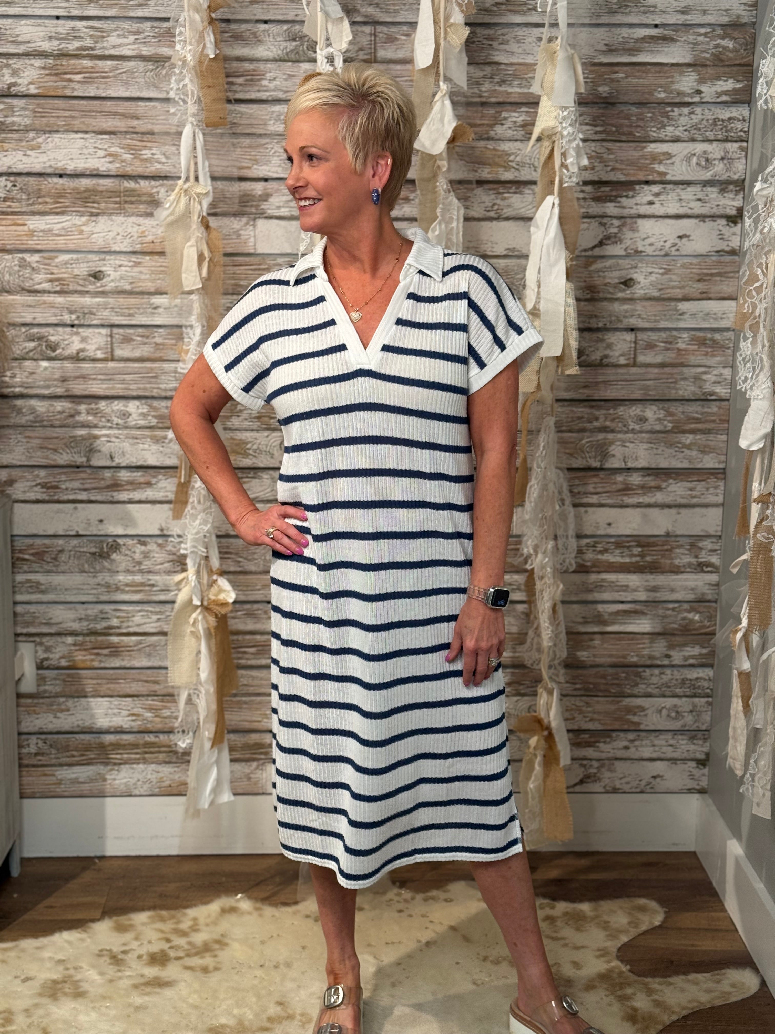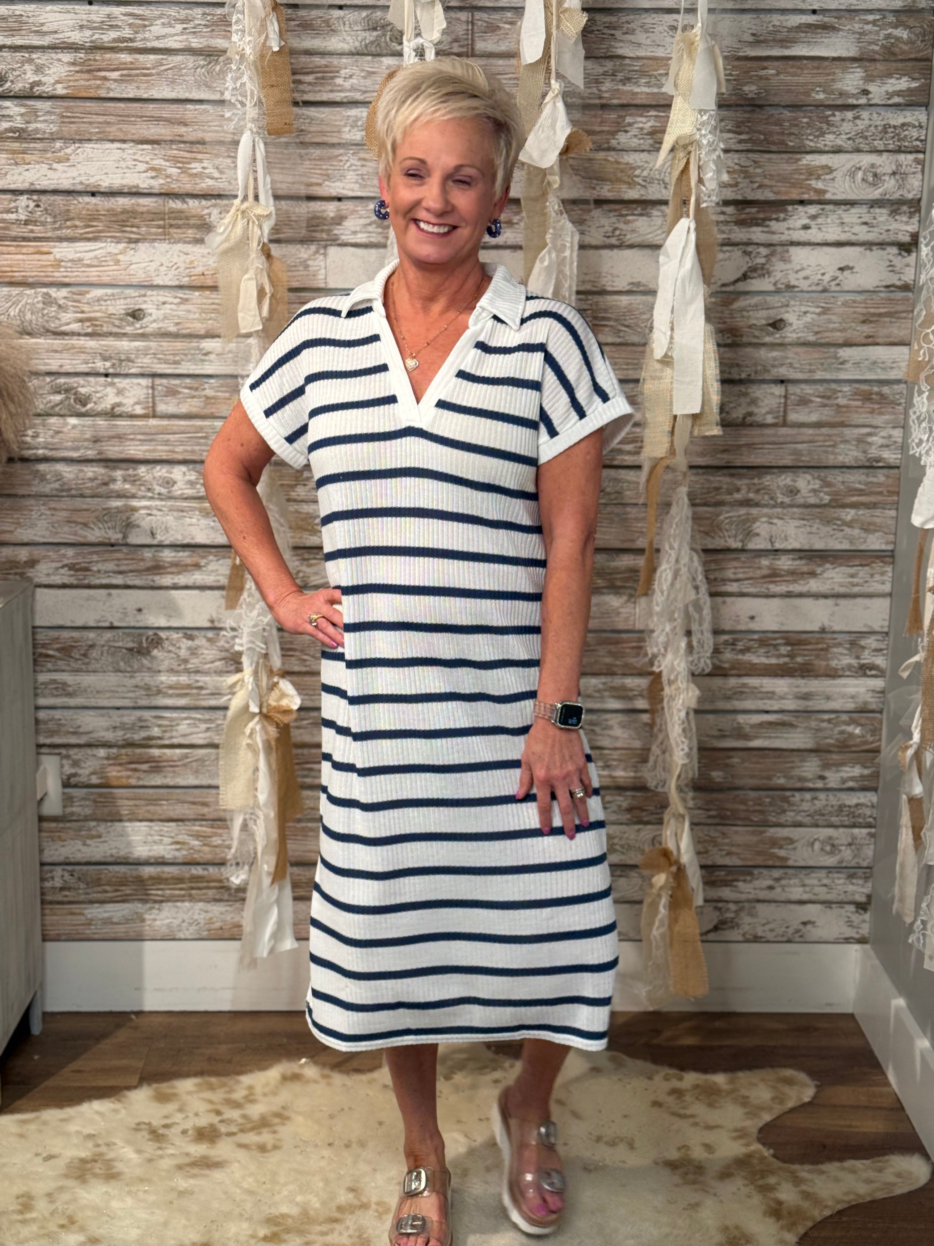 Meet your new summer staple: the Sailaway Stripe Midi. This breezy knit dress features nautical blue stripes, a relaxed oversized fit, and a polished collared split neckline. Finished with cuffed short sleeves and subtle side slits, it’s the perfect blend of preppy and casual for sunny escapes or easy weekend wear.