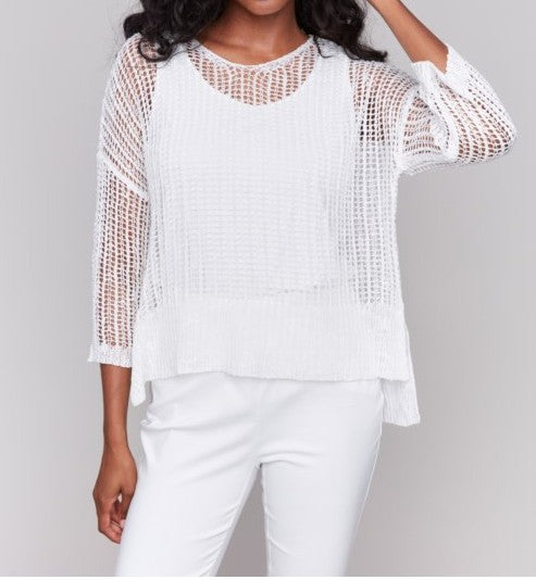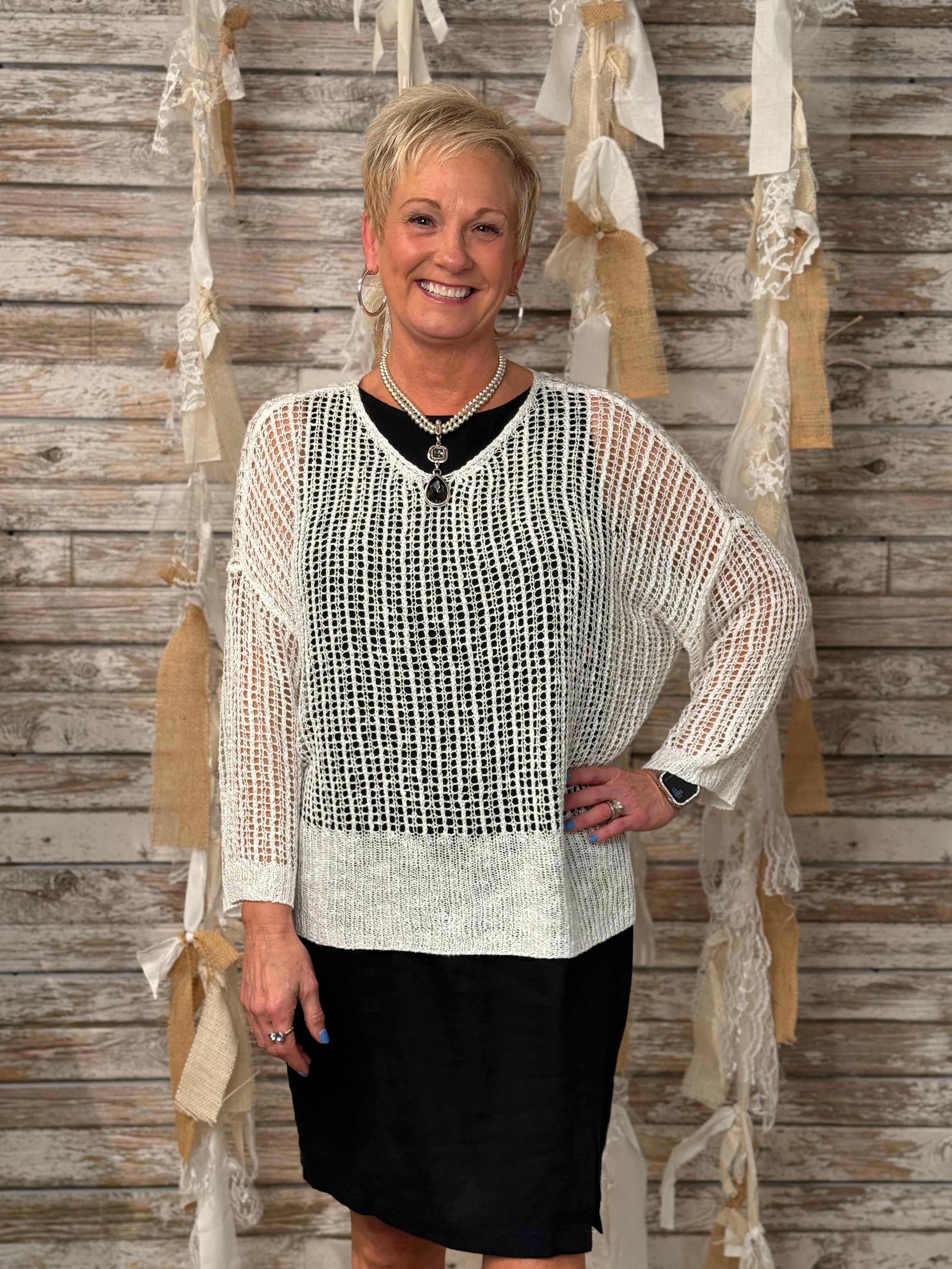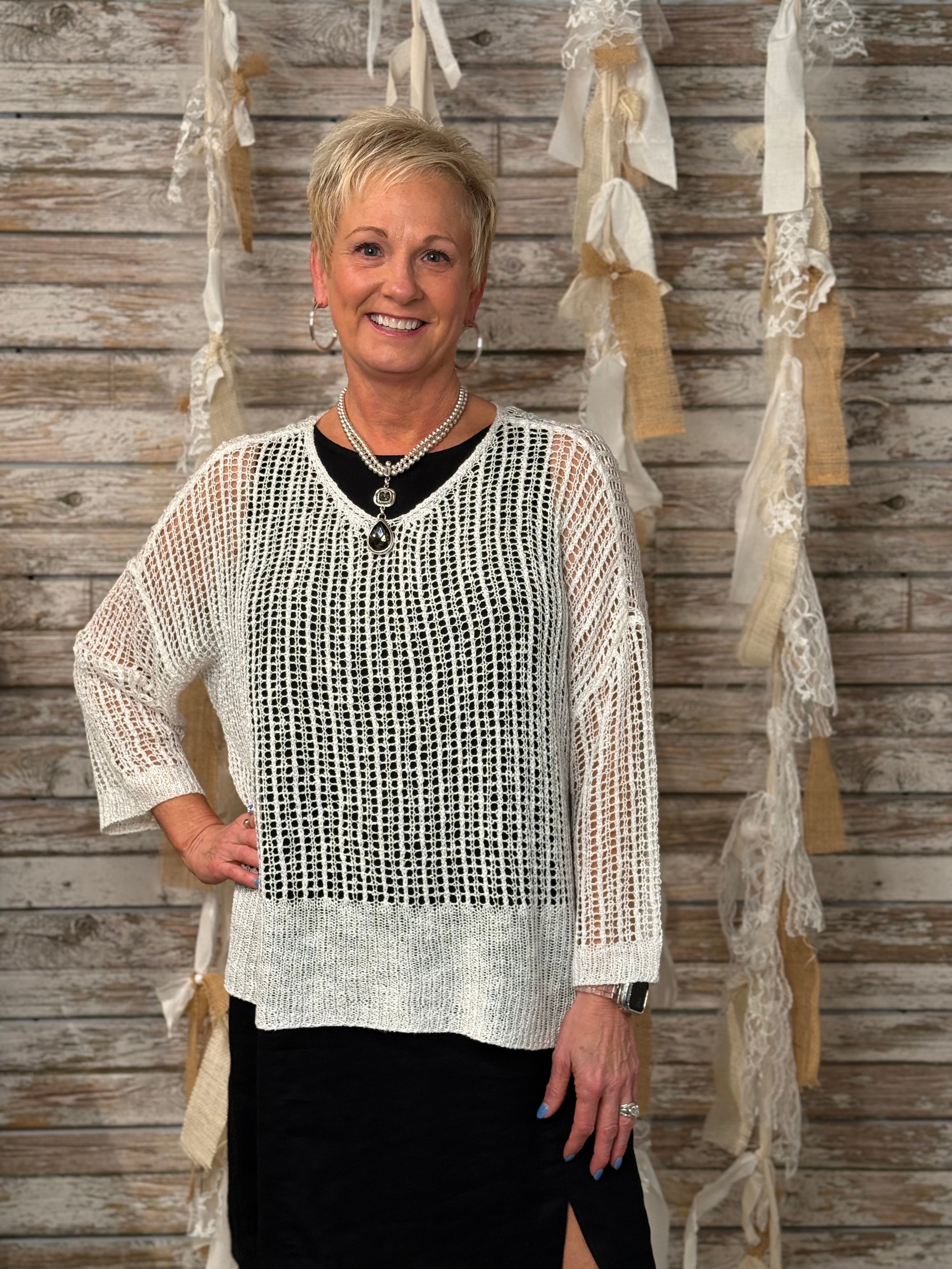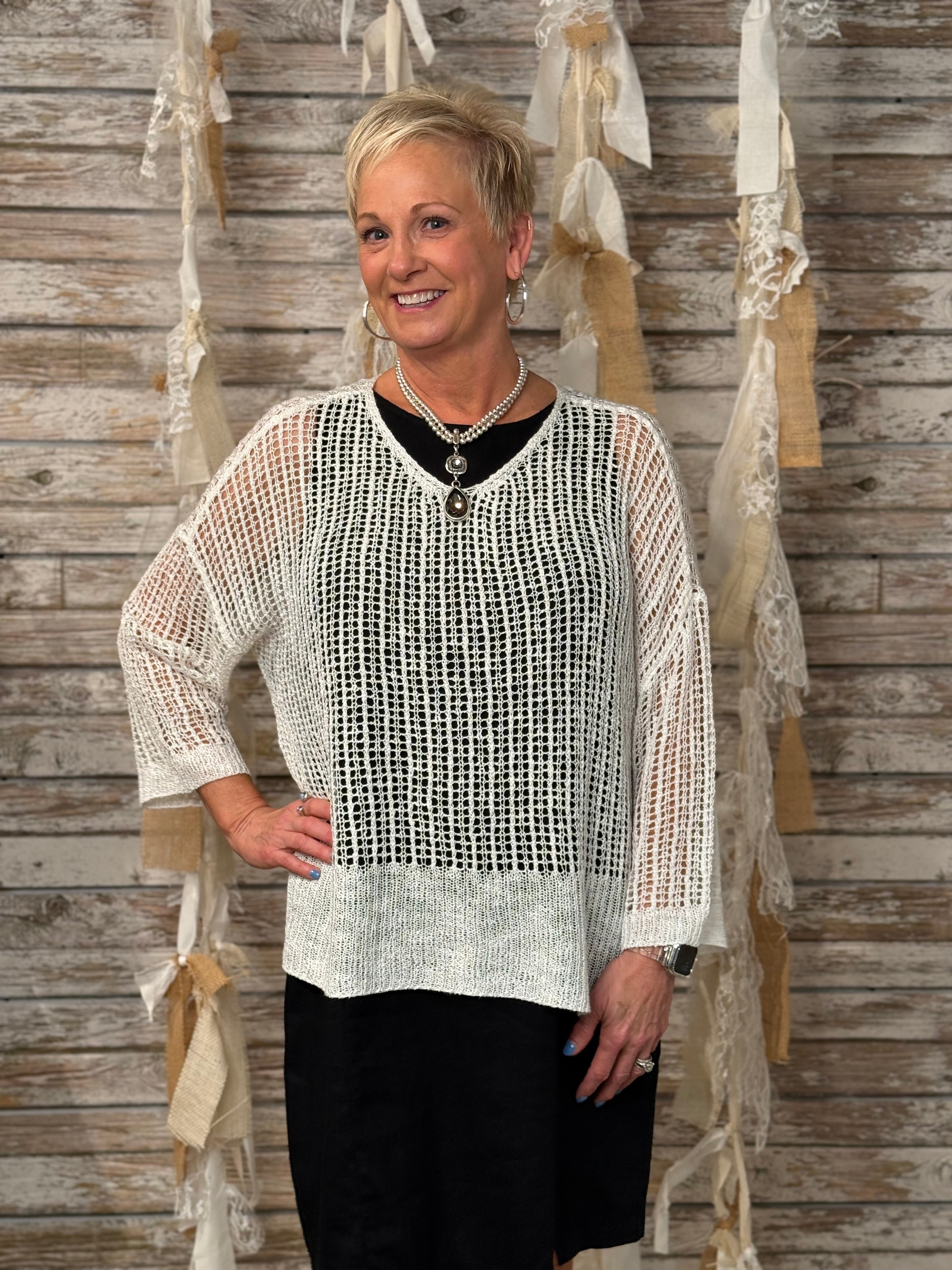 Light as a sea breeze, the Salt Air Knit Pullover is your effortless layering essential. Featuring an airy open-knit design with 3/4 sleeves and a relaxed silhouette, this sheer white top pairs perfectly over tanks or swimsuits. Its easy scoop neck and high-low hem offer a flattering fit that flows from beach days to brunch with ease.