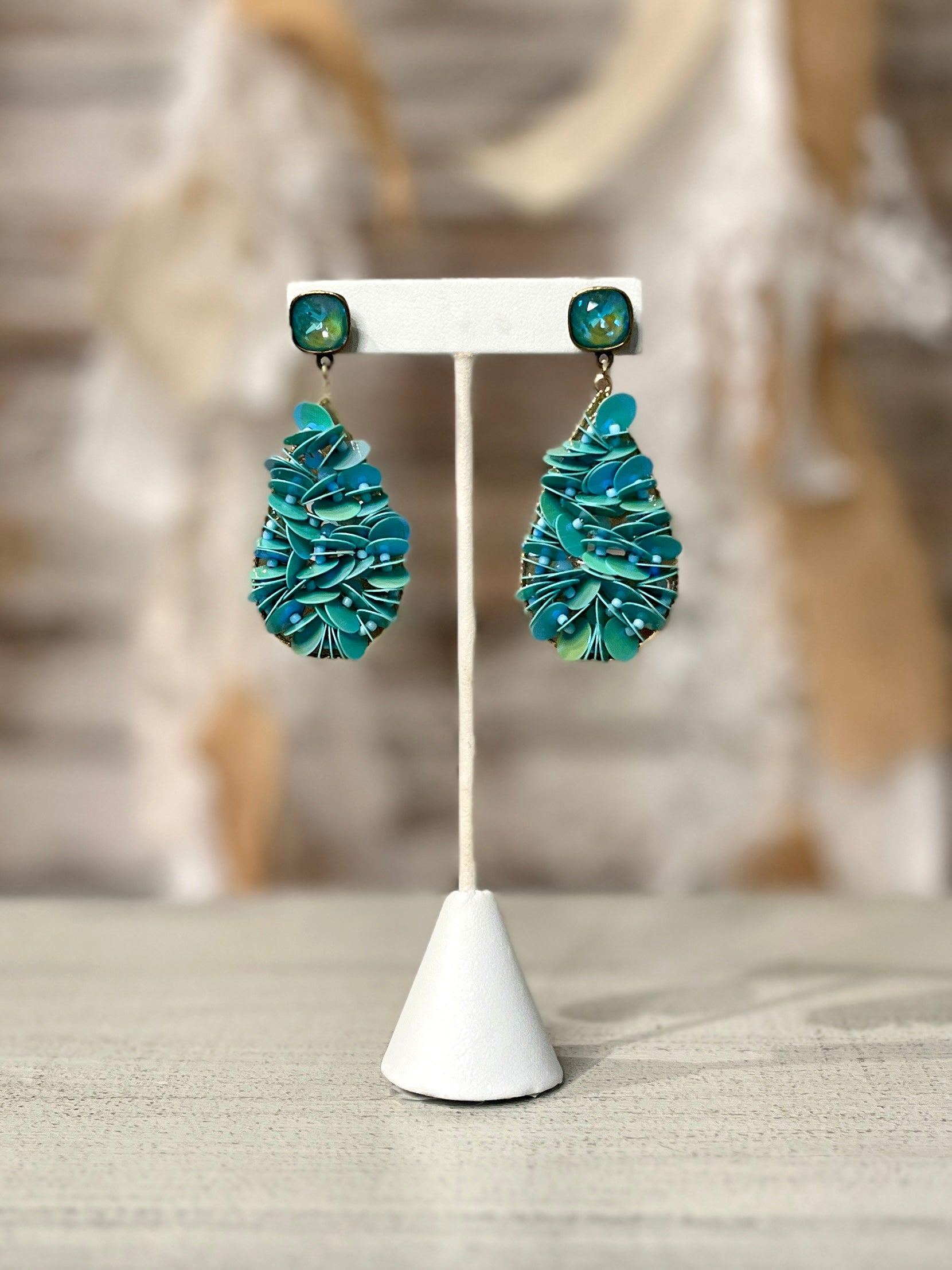 Make a splash with the Sea Breeze Sequin Earrings—featuring ruffled layers of shimmering turquoise sequins and topped with a brilliant Austrian crystal stud. Light-catching, playful, and full of movement, these statement earrings bring bold, beachy vibes to any outfit. Perfect for vacations, festivals, or whenever you want to turn heads!