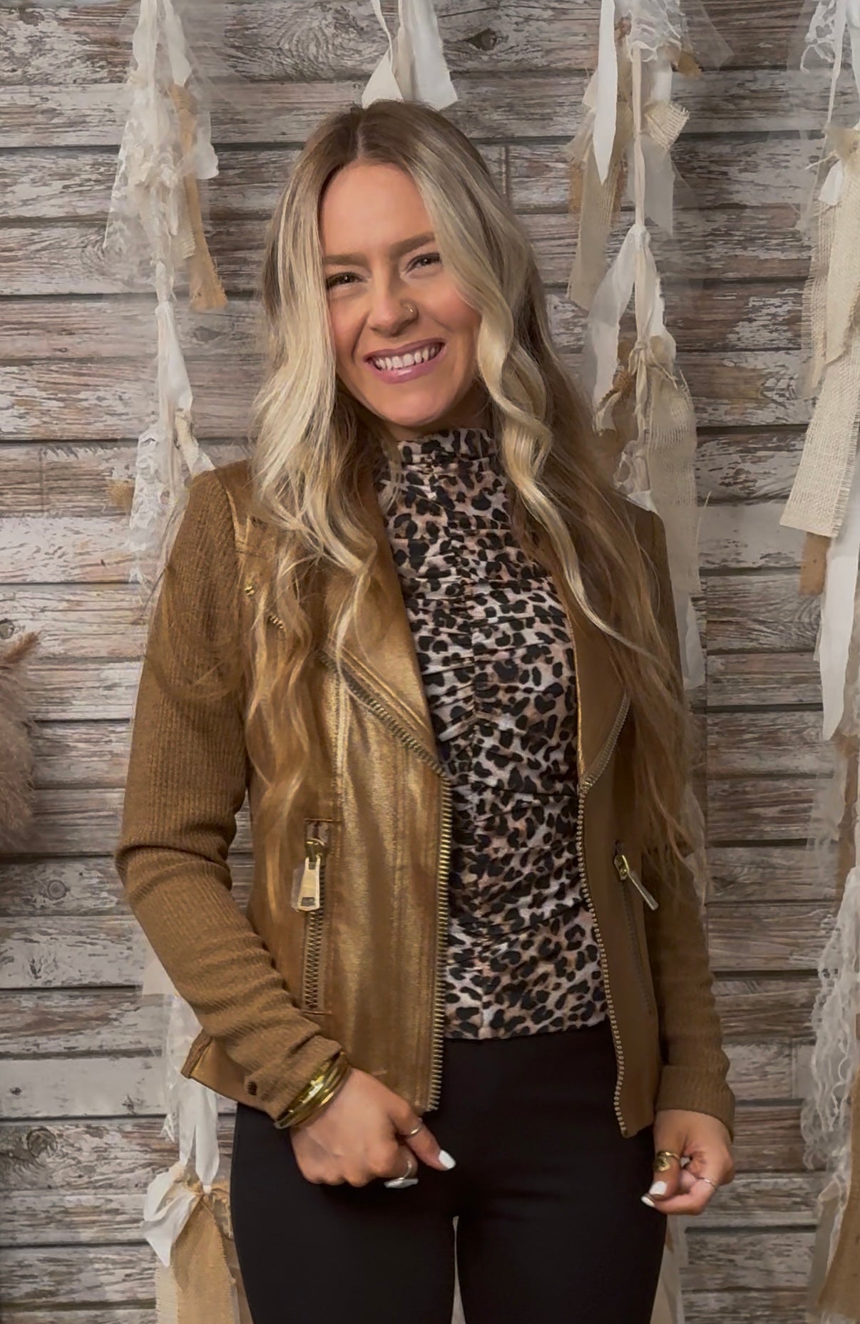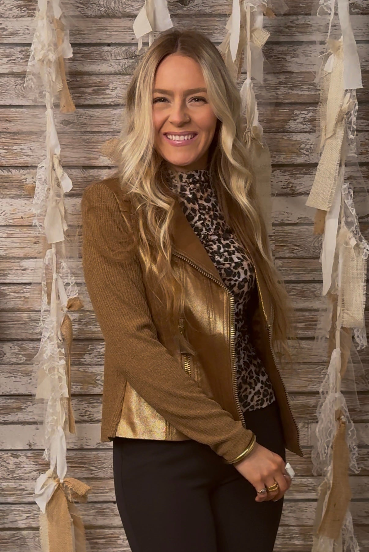 Meet the Shine & Spine Perfecto: where edgy meets effortless. This striking jacket pairs gleaming foil-finish leather with soft rib-knit panels for a fit that hugs in all the right places without sacrificing attitude. With its iconic moto silhouette and bold textural contrast, it’s the perfect layer to light up your night (or just your Tuesday).