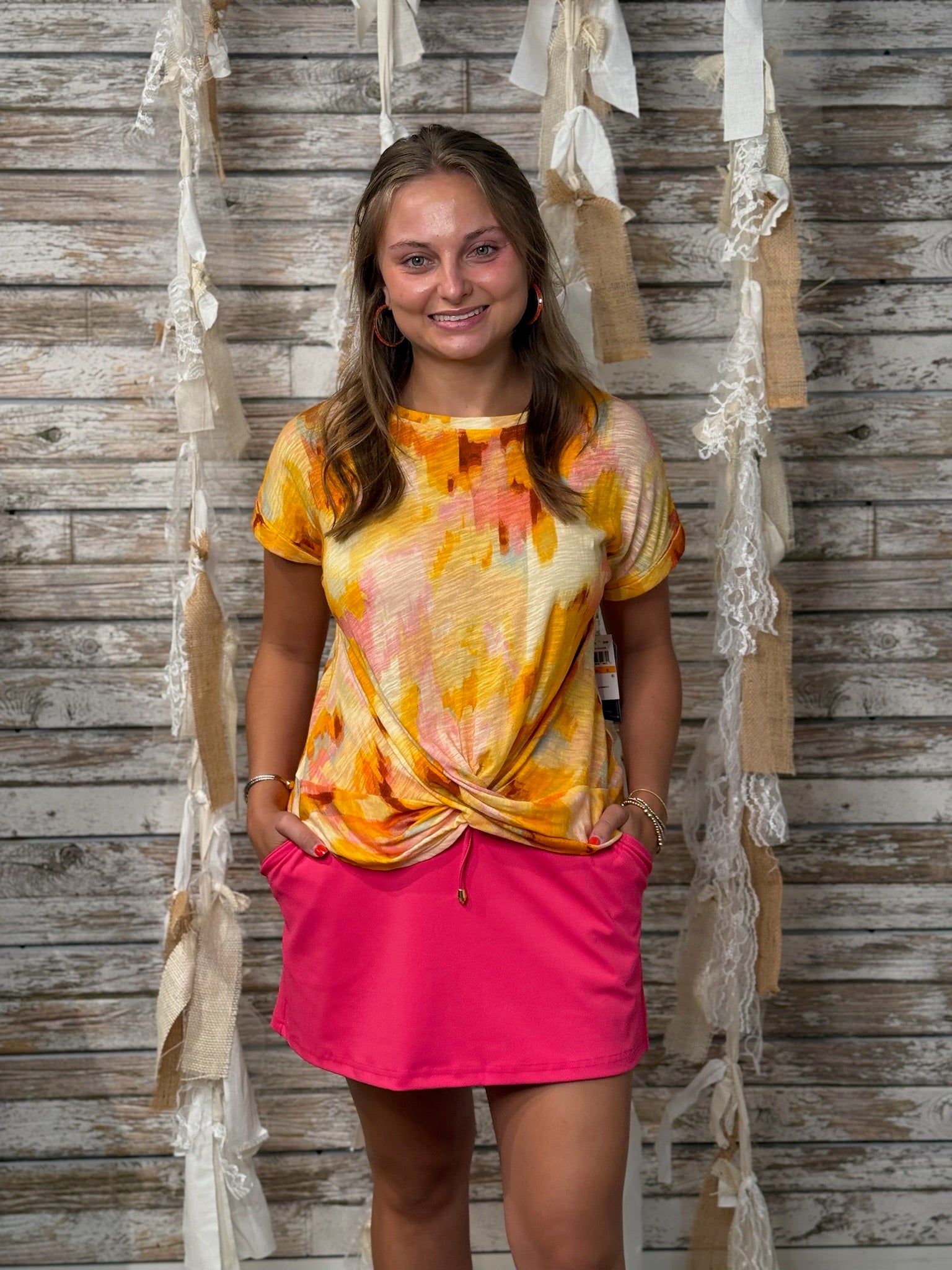 Short extended roll cuff sleeve scoop neck, twist front hem printed knit top