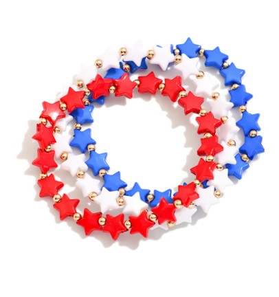 Stack on the spirit with the Star-Spangled Stack Bracelets! This festive trio features stretchy beaded bracelets adorned with red, white, and blue star beads accented by gold-tone rounds. At approximately 3" in diameter, they’re the perfect patriotic pop for your wrist—ideal for holiday cookouts, fireworks shows, or showing off your USA pride all summer long!