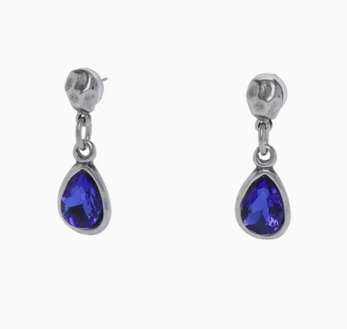 Graceful and glowing, the Twilight Drop Earrings feature deep violet teardrop crystals suspended from antique silver studs. Their timeless shape and rich color make them the perfect finishing touch for both everyday elegance and evening sparkle.