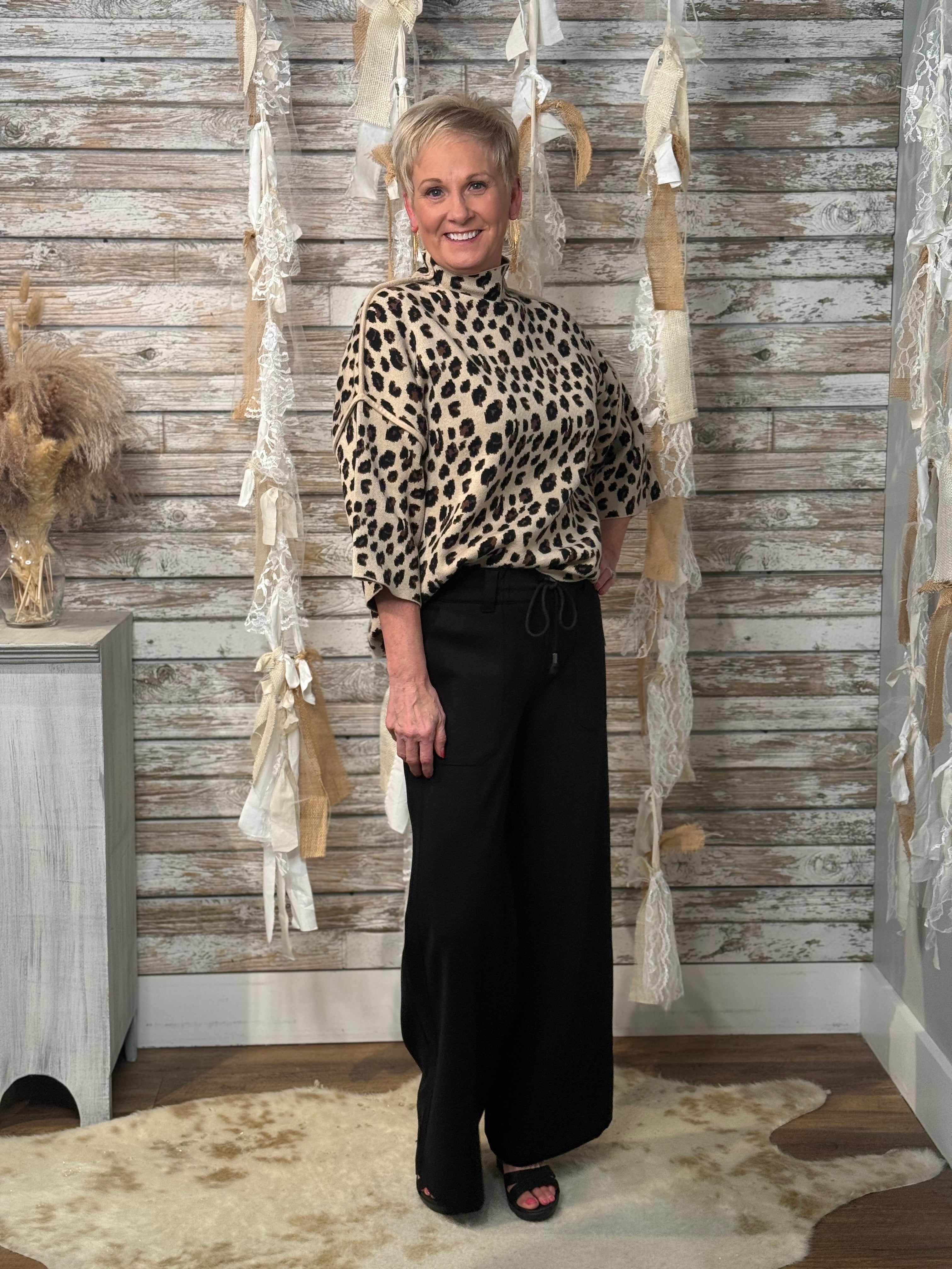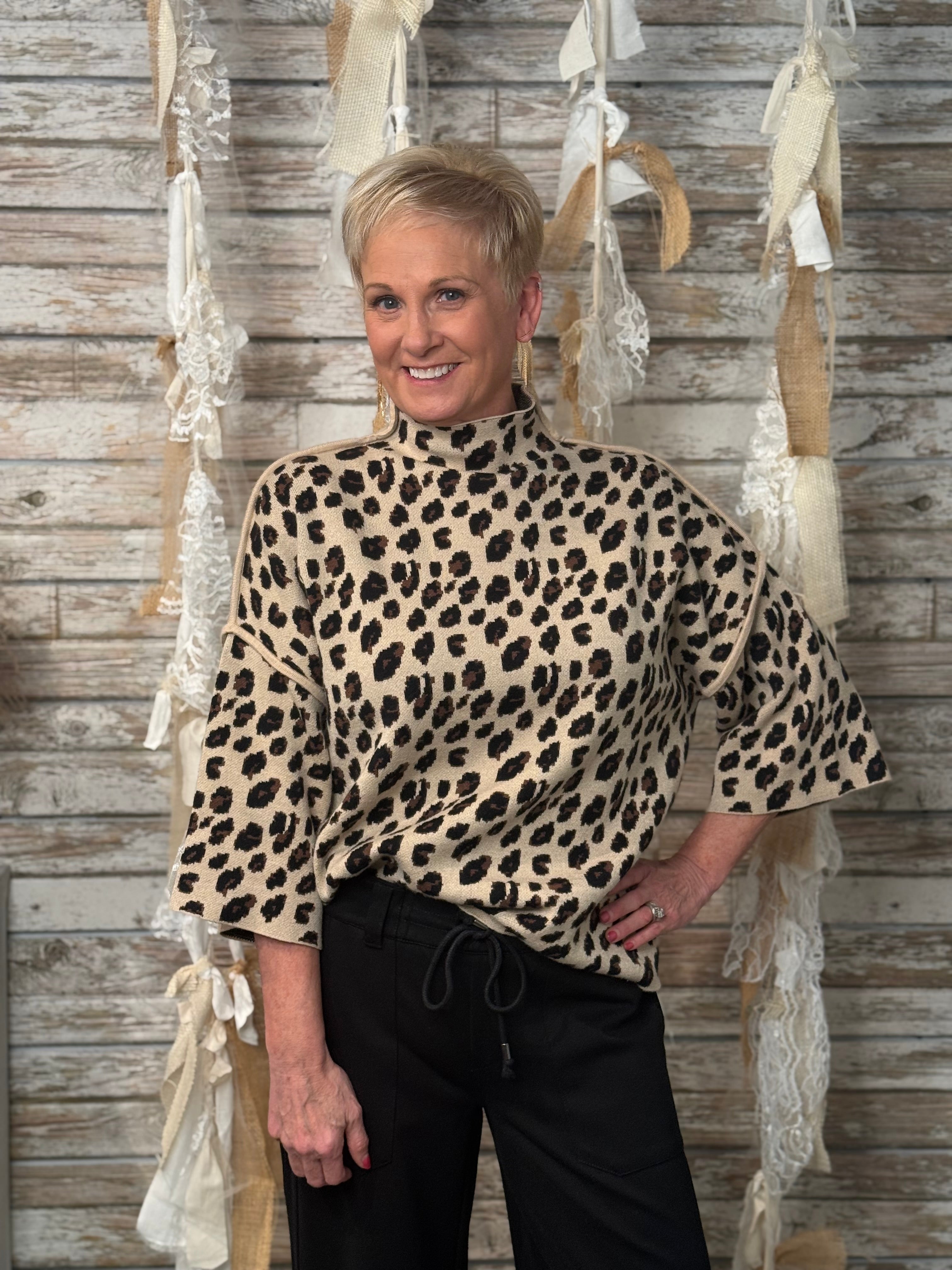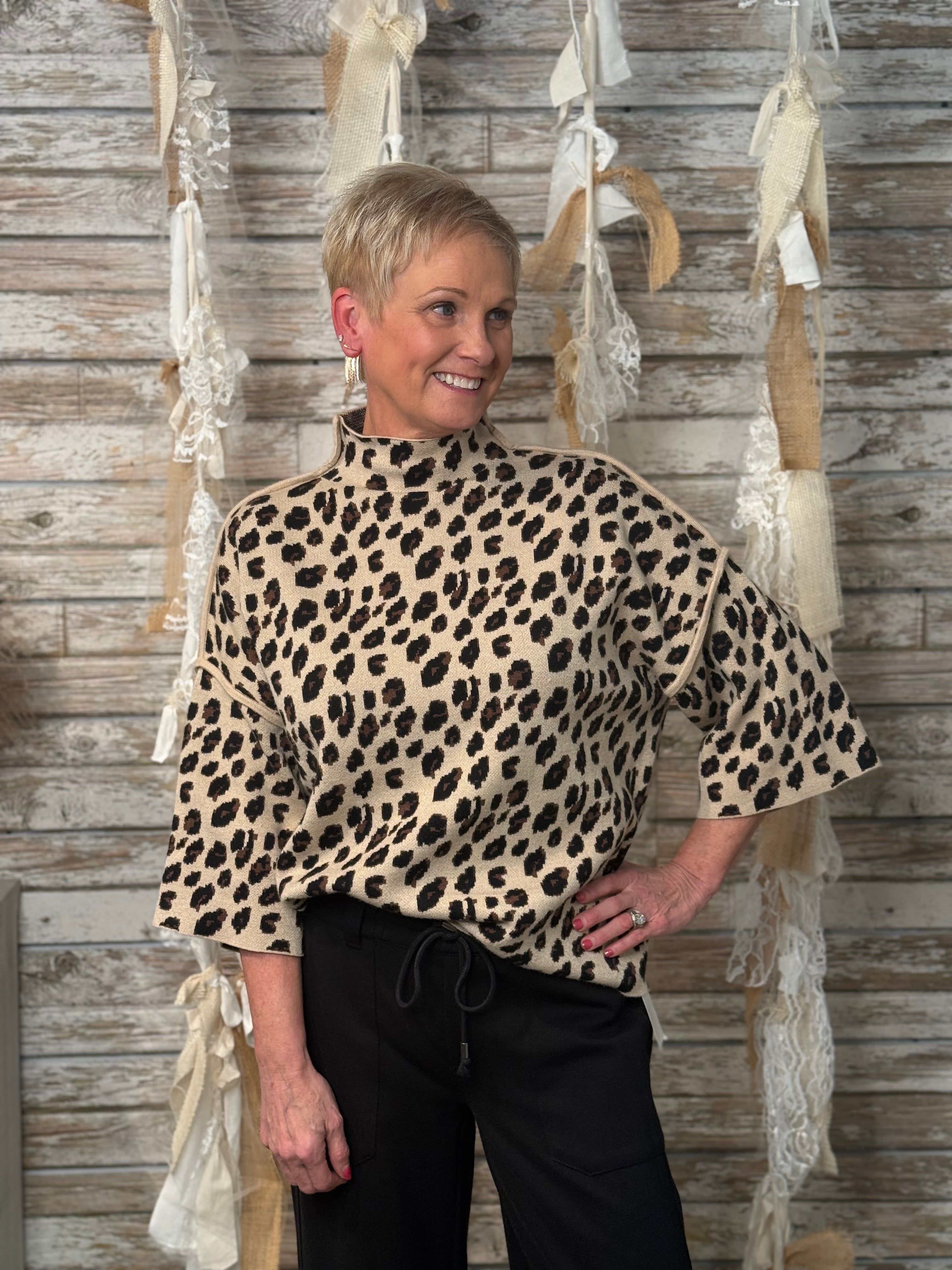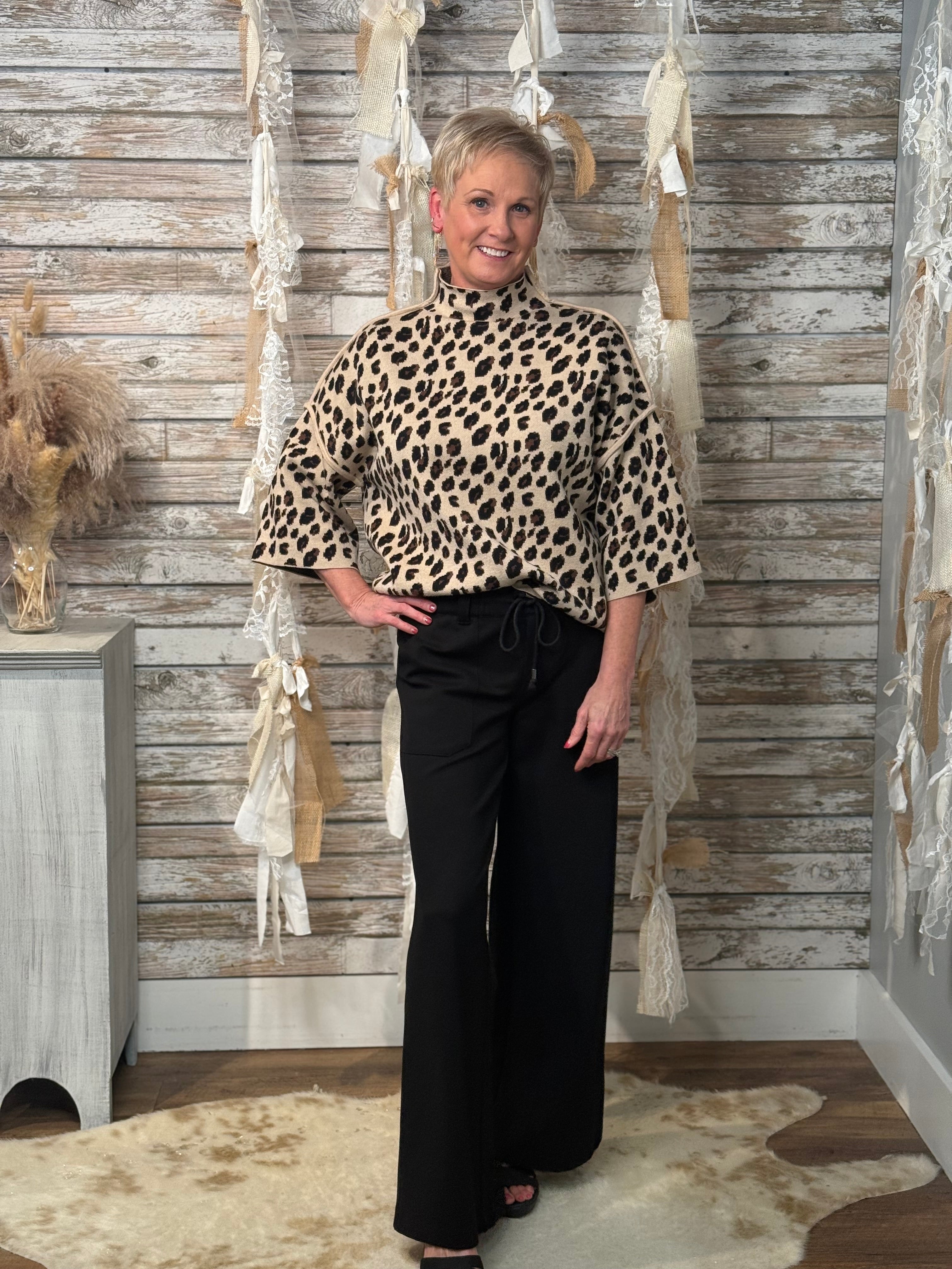 Fierce meets sophisticated in the Untamed Luxe Mock Neck Sweater. With its bold leopard print and chic mock neckline, this relaxed silhouette strikes the perfect balance of wild energy and elevated style. The wide sleeves and easy drape make it as comfortable as it is eye-catching—ideal for pairing with sleek black denim, leather pants, or even a skirt when you’re ready to unleash your inner style predator.