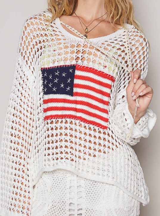 V-neck, long sleeve, regular fit hoodie sweater top in cotton with American flag, stitch point, rolling edge, trim loop, solid color.