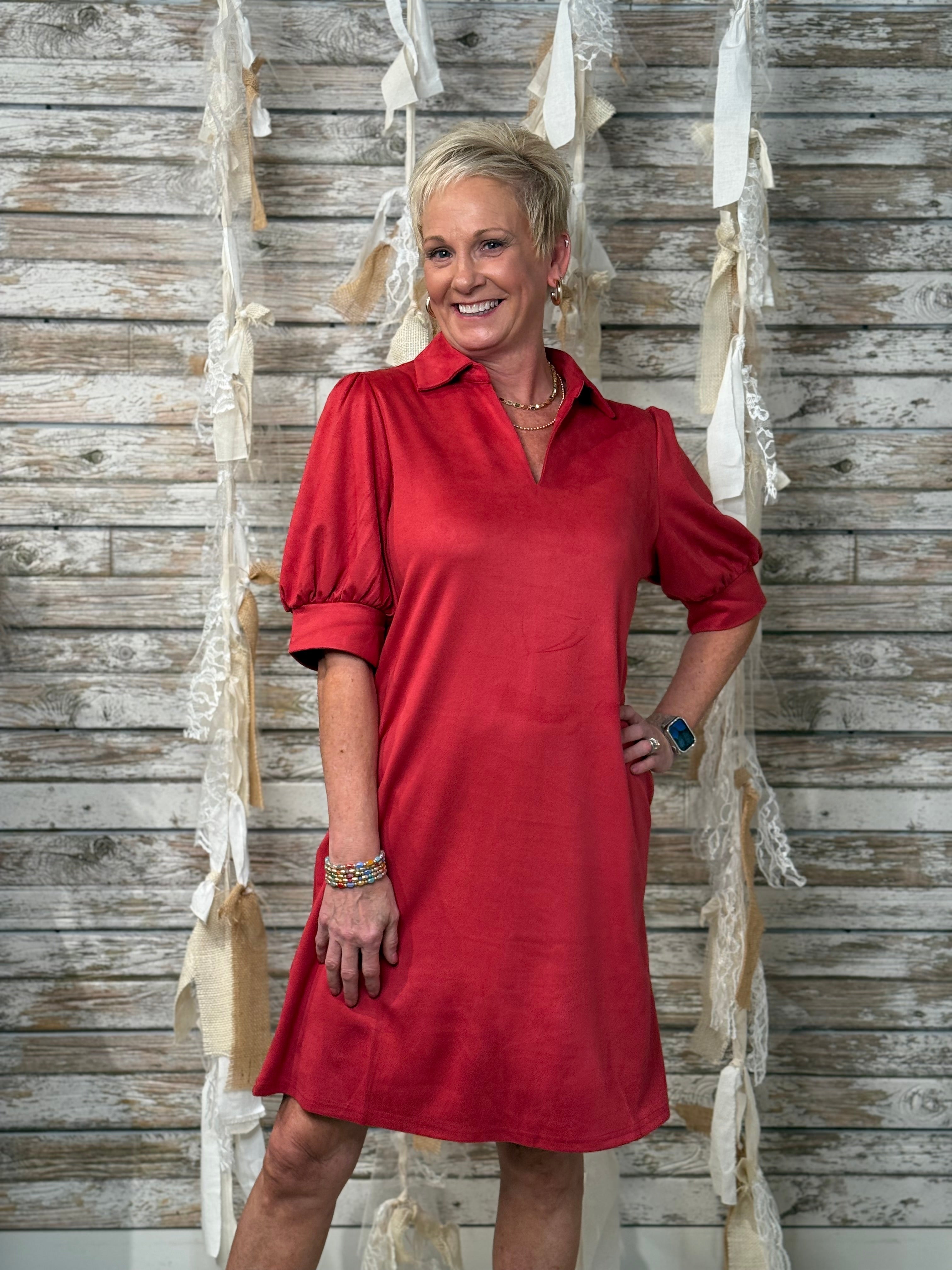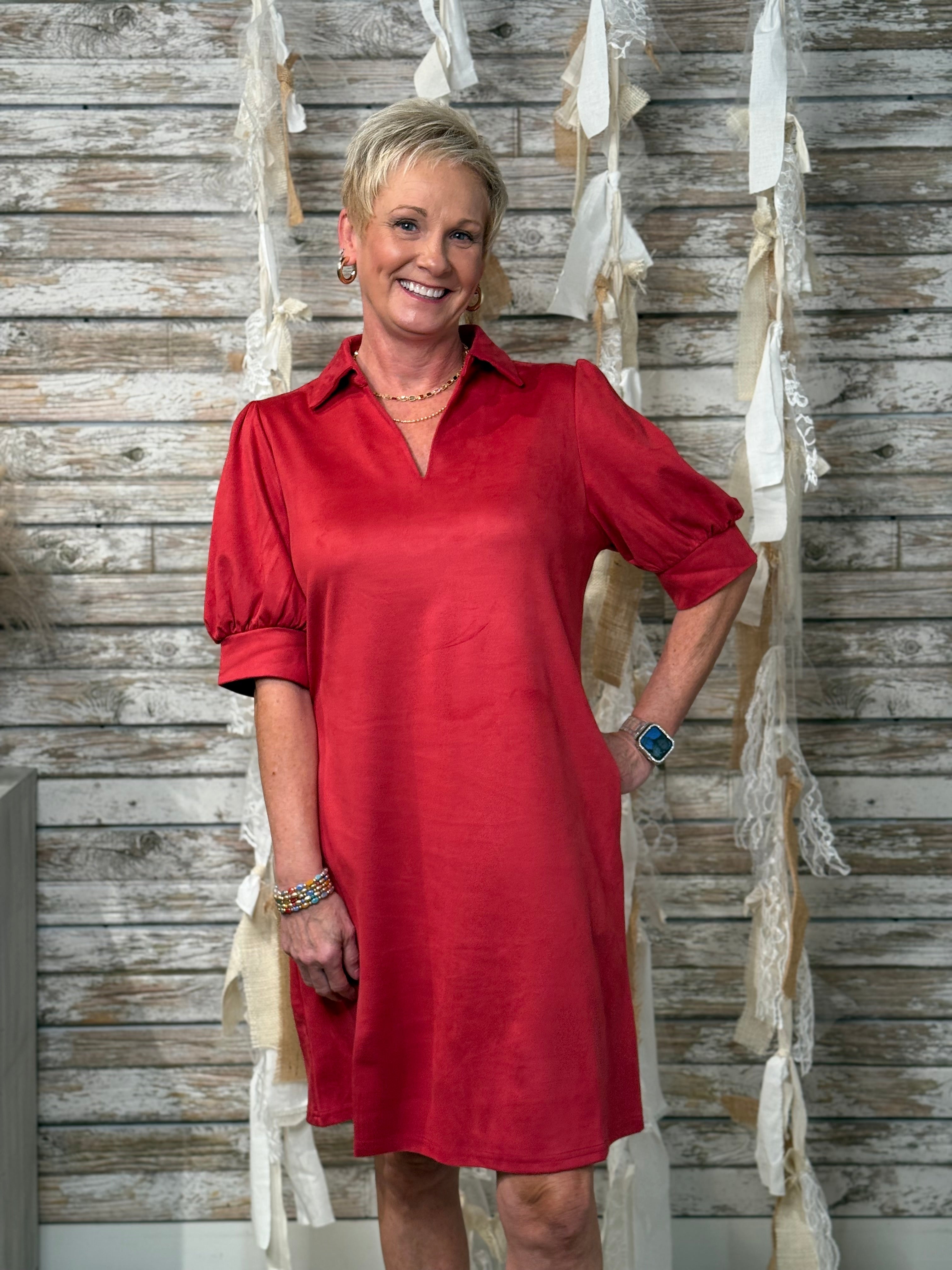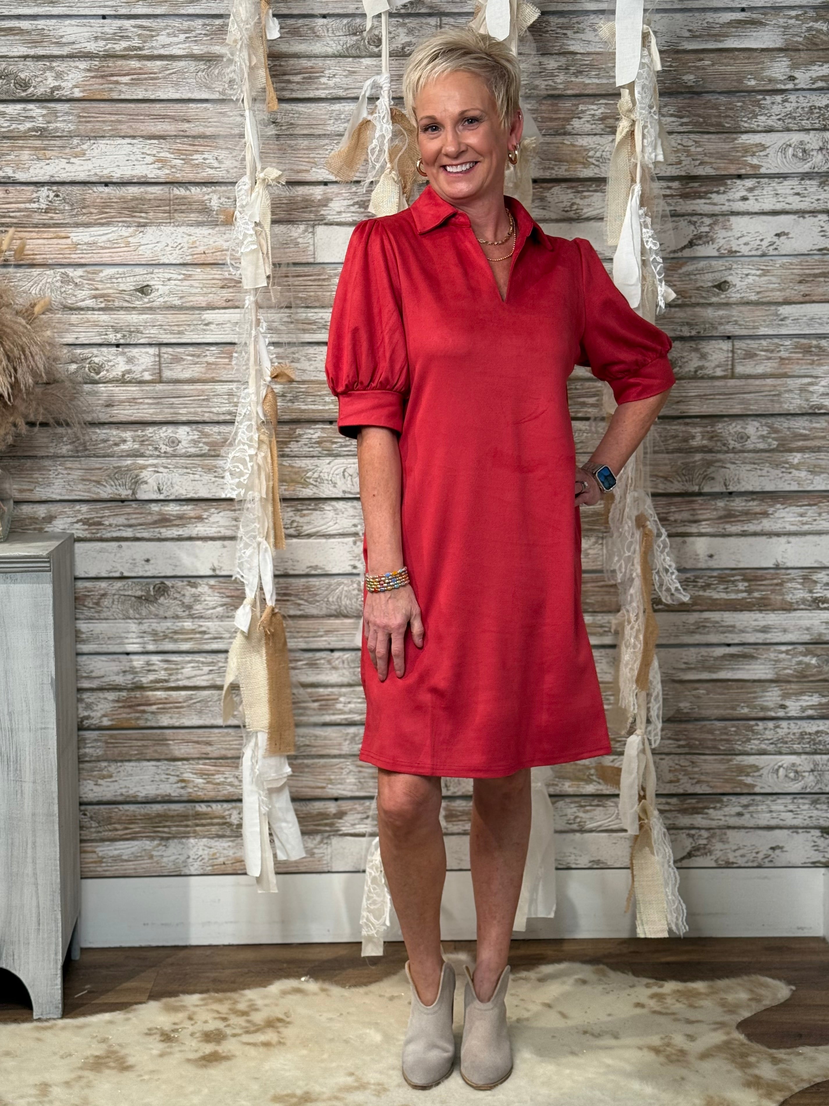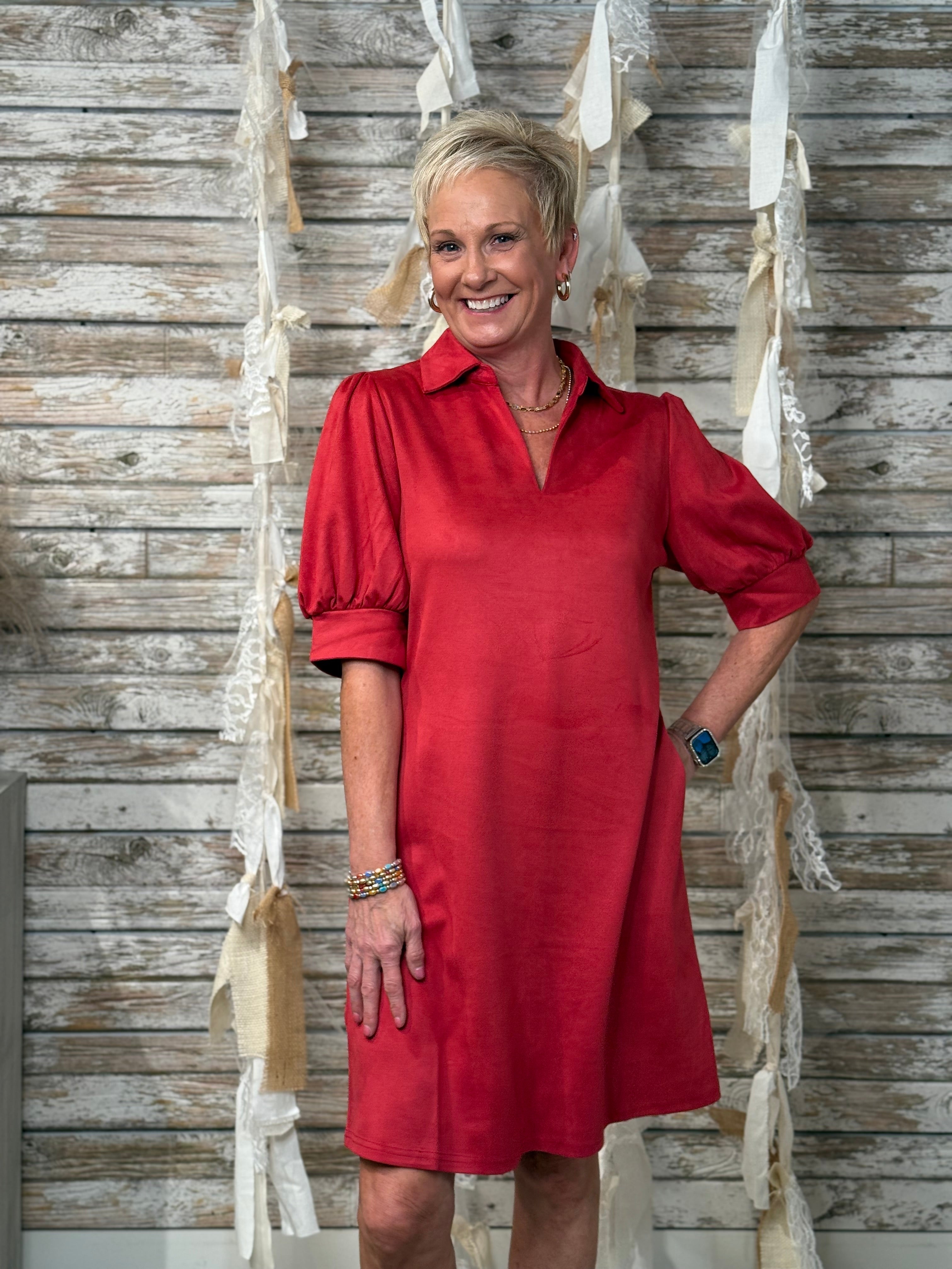 Soft to the touch and bold in silhouette, the Velvet Whispers Dress is all about quiet drama. Made from luxe faux suede, it features bubble sleeves that add a touch of romantic flair to its streamlined silhouette. Effortlessly elegant and unbelievably cozy, it’s the perfect piece for when you want to feel dressed up without trying too hard. Just add boots and let the compliments roll in.