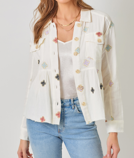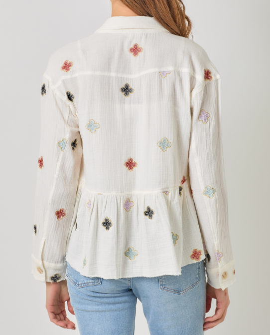 This cute and stylish jacket features delicate embroidery in a washed texture and flattering peplum silhouette.