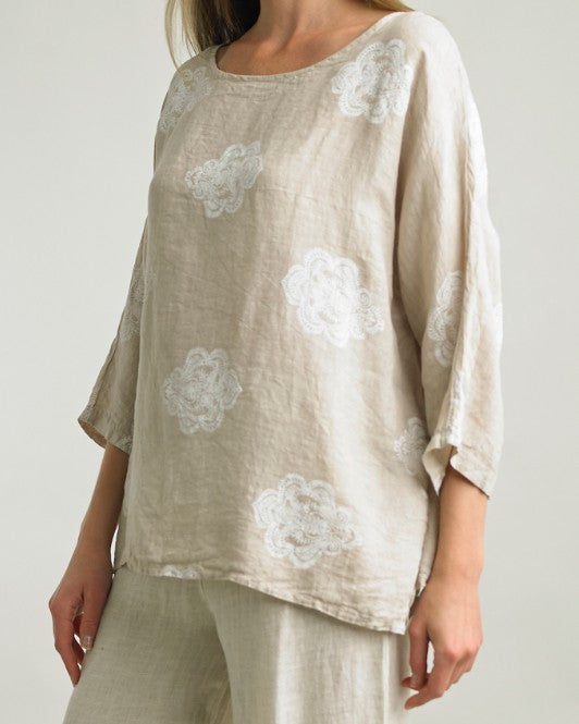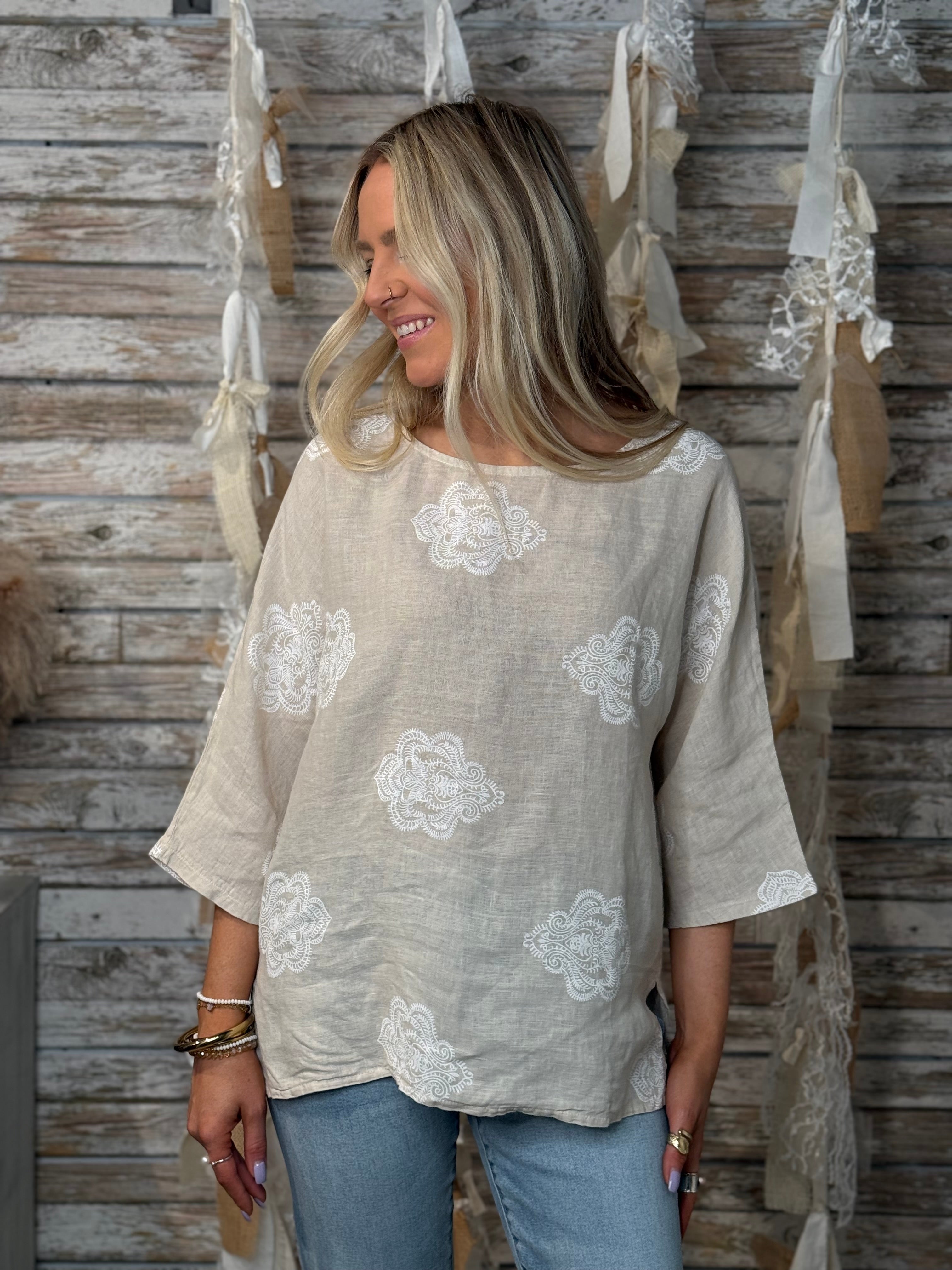 Soft, serene, and effortlessly refined — the Whisper Bloom Top features a relaxed linen silhouette adorned with delicate white floral embroidery. Designed with a wide boat neckline and 3/4 sleeves, this breezy blouse brings an airy elegance to everyday dressing, perfect for coastal getaways or slow mornings in the sun.