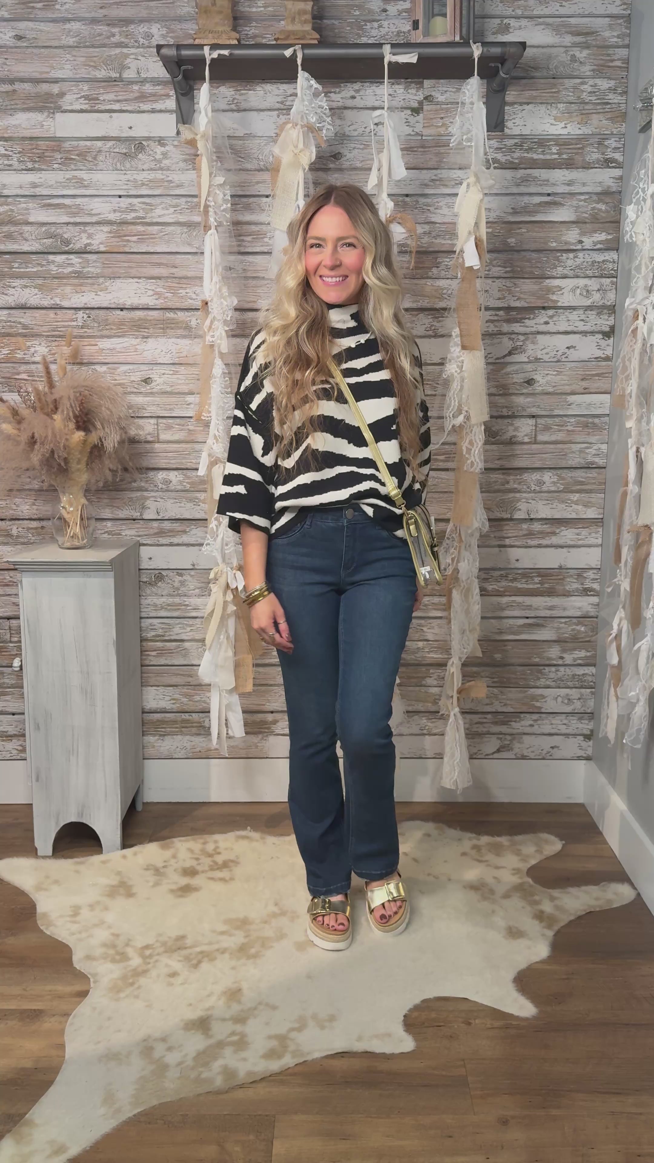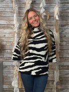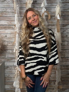 Make a bold statement with the Wild Streak Mock Neck Top. Featuring a striking black-and-ivory zebra print, this relaxed silhouette combines playful edge with effortless sophistication. The mock neckline and wide sleeves add a modern touch, while the soft knit fabric keeps it easy and comfortable for all-day wear. Pair with sleek denim or leather leggings when you’re ready to show off your untamed style.