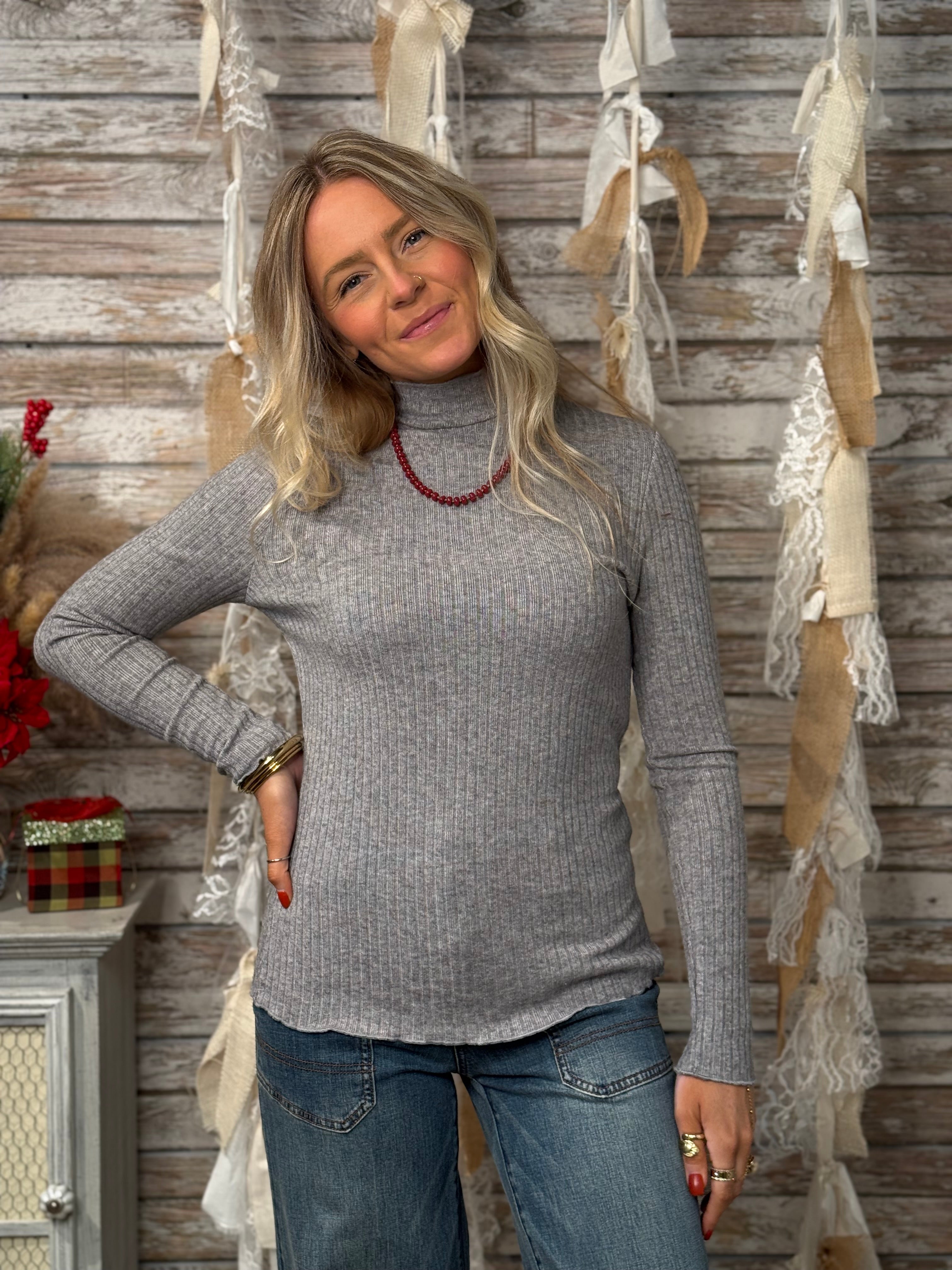 This women’s ribbed mock neck top is the perfect blend of comfort, stretch, and style. Designed with a heavy rib knit fabric, it offers a flattering, body-skimming fit that moves with you. The lettuce edge detailing on the neckline, sleeves, and hem adds a soft, feminine touch, making this long sleeve top easy to dress up or down.
